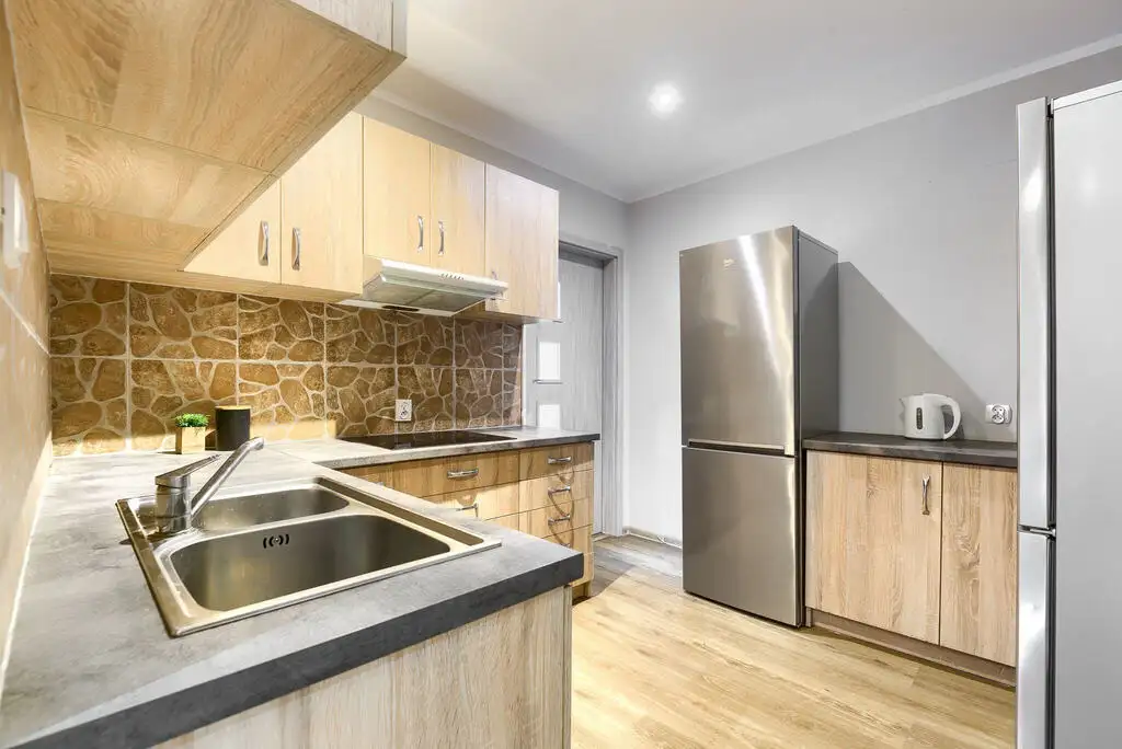 Lokator będzie miał dostęp do kuchni, korytarza, 2 łazienek. W kuchni znajdziemy 2 lodówki, opiekacz, mikrofalę, okap, indukcję oraz półki do przechowywania. W łazienkach są prysznice. W mieszkaniu jest 8 pokoi.