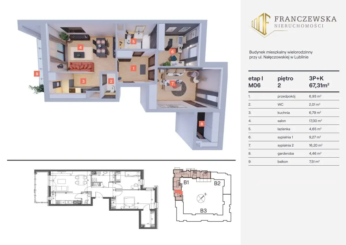 Dwustronne, trzypokojowe mieszkanie o powierzchni projektowej 67,38 m² z wystawą okien na północny-wschód i południowy-zachód.