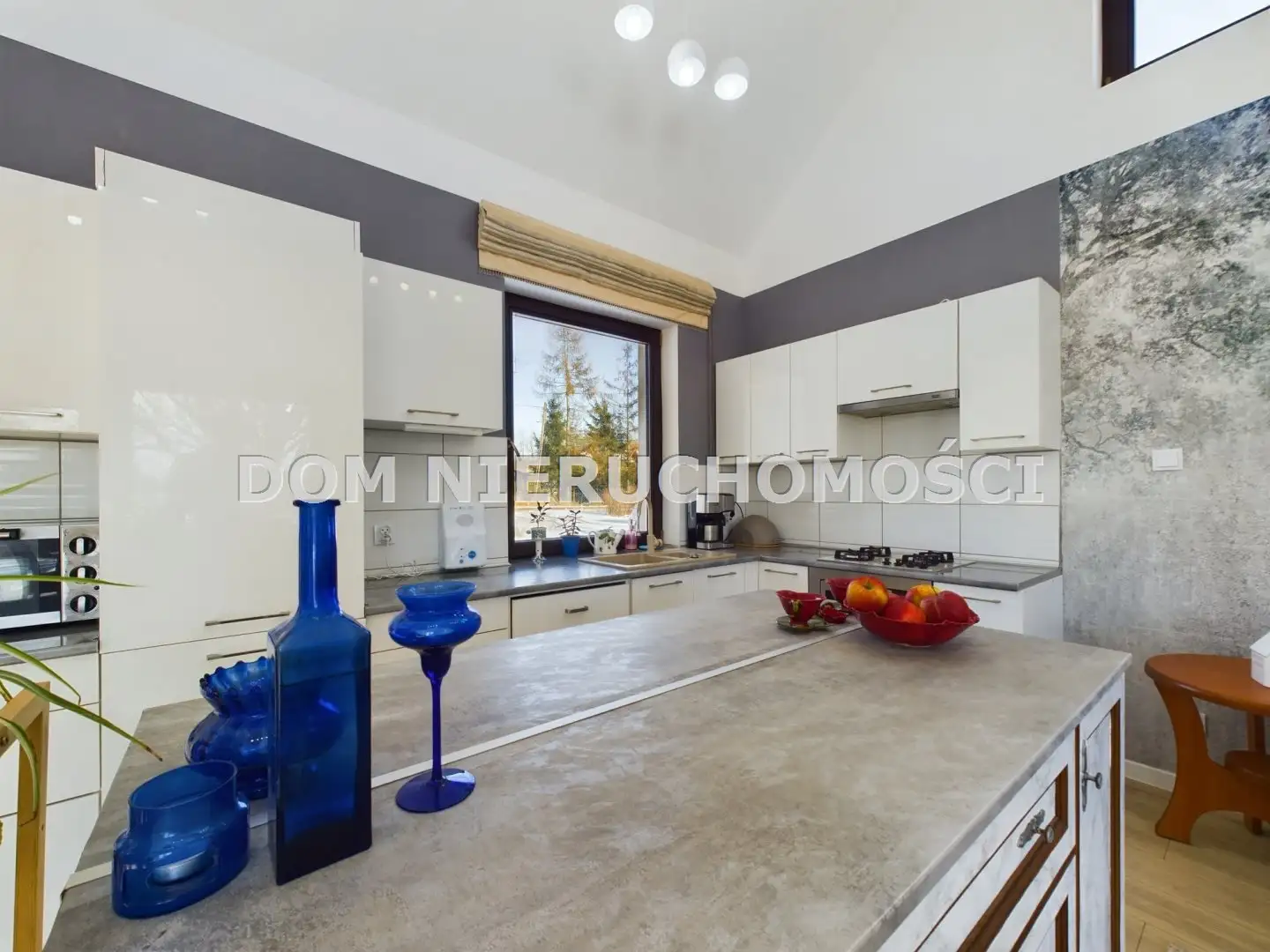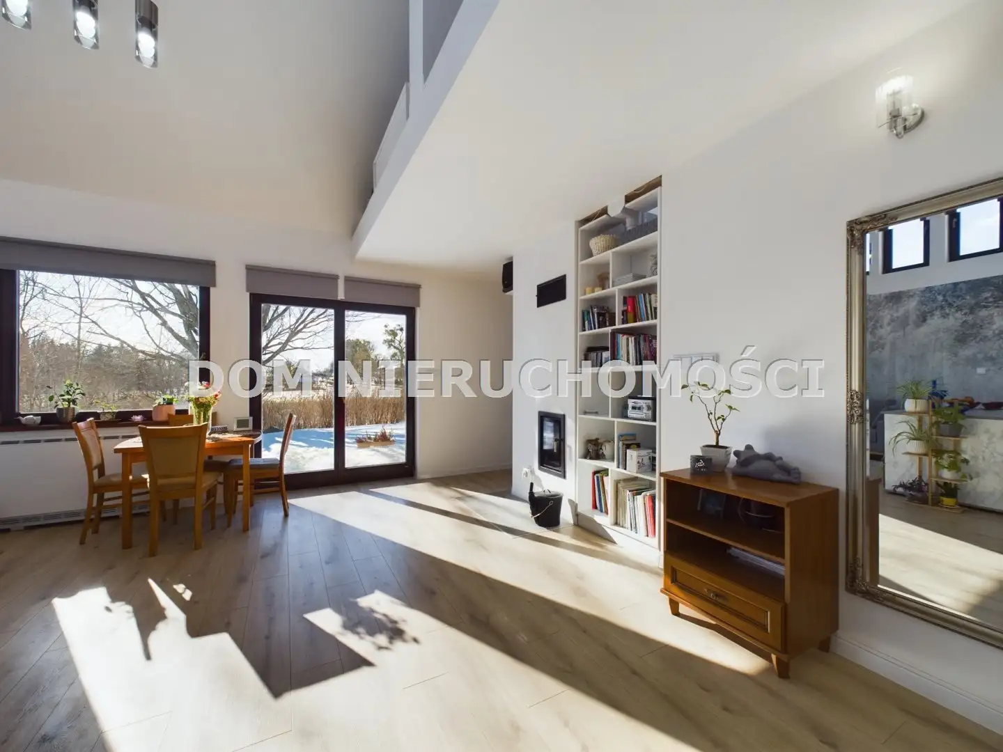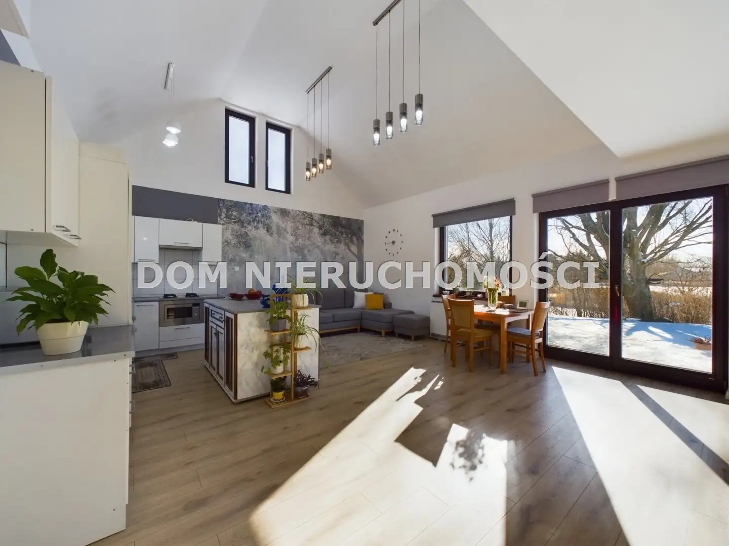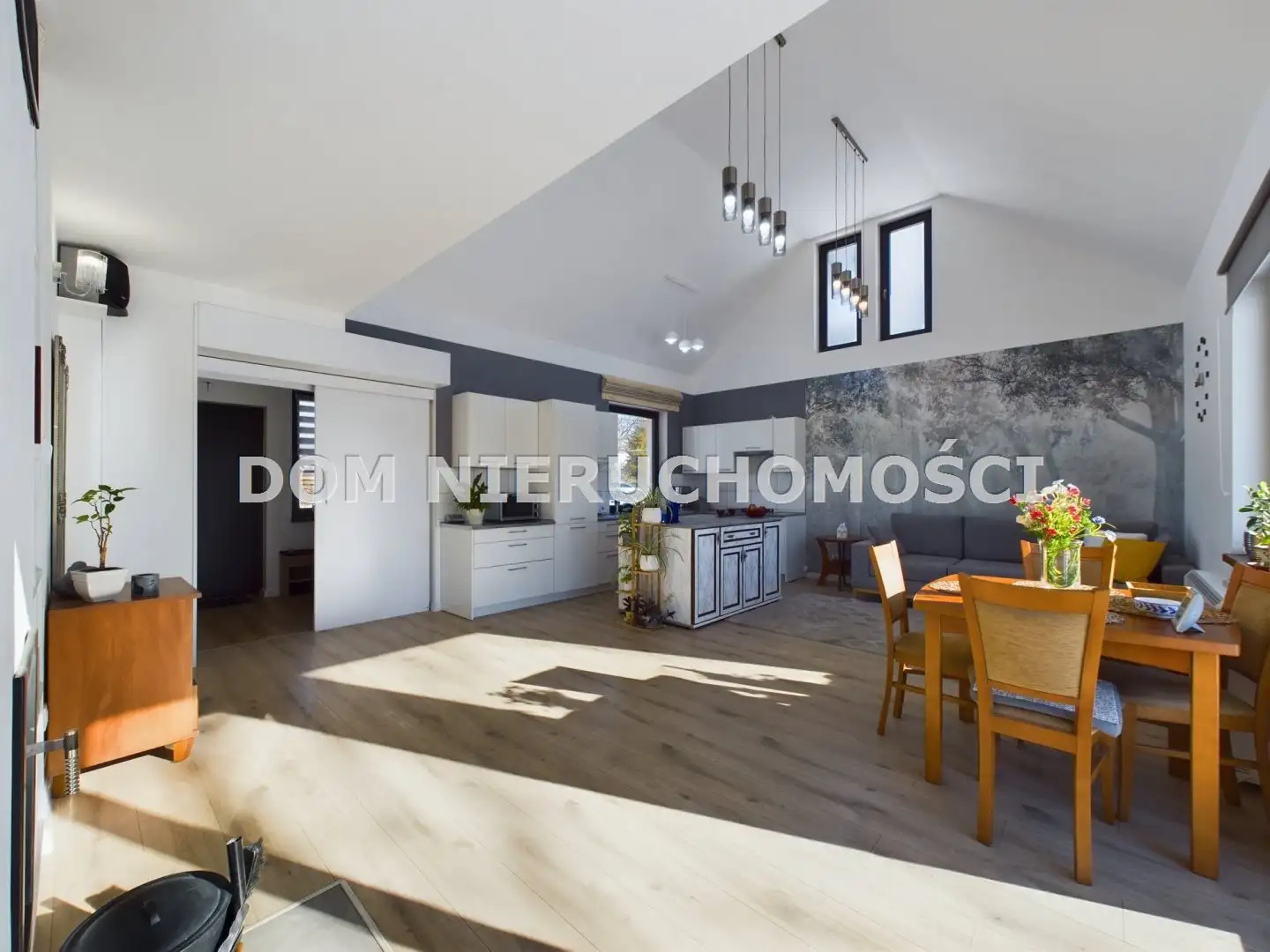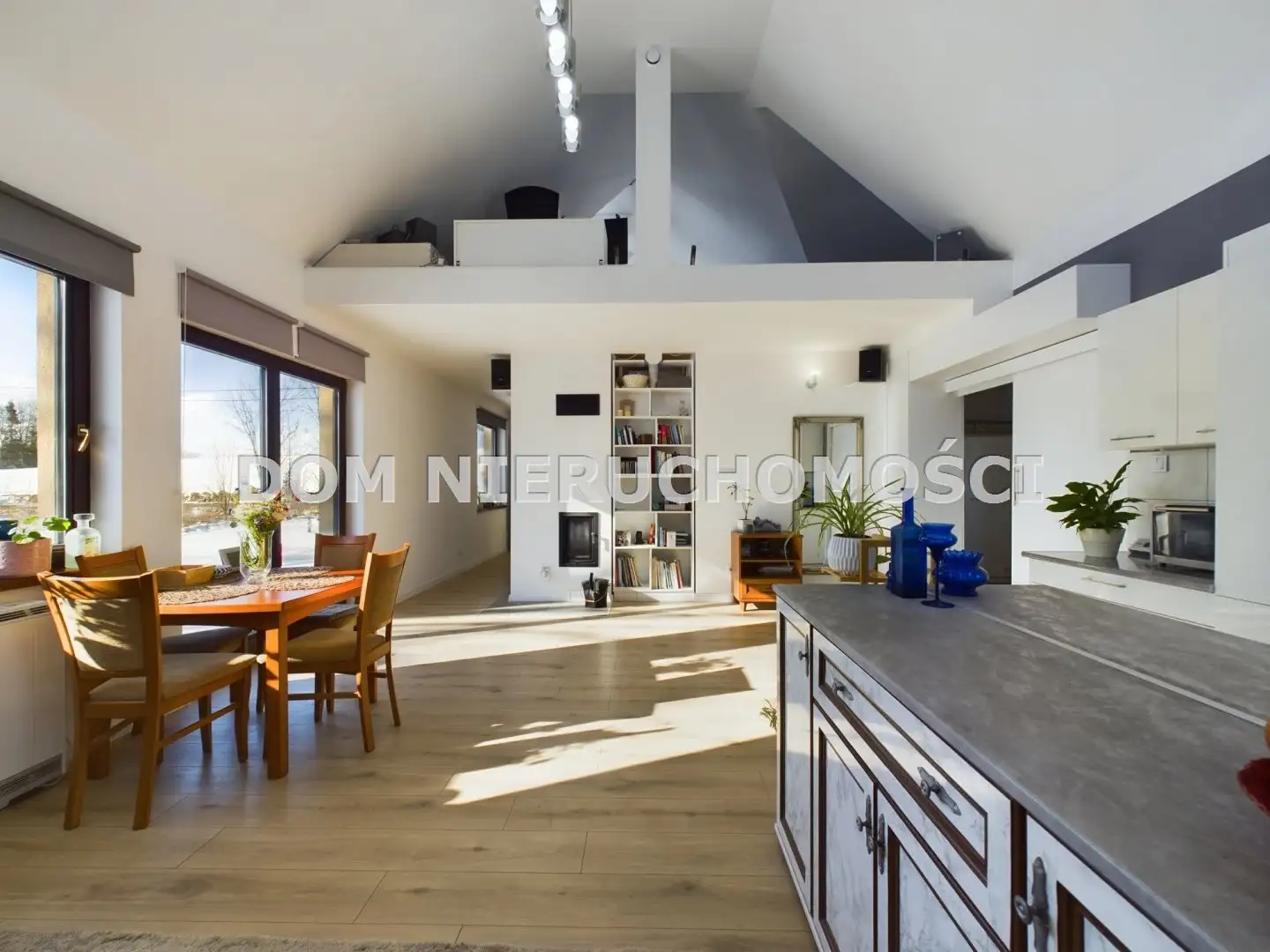 Wnętrze domu zostało zaprojektowane na zasadach otwartego planu. Strefa dzienna parteru to przestronny salon z kominkiem i jadalnią, z którego jest wyjście na przyległy taras. Elementem wartym podkreślenia są duże przeszklenia, które dostarczają dużo naturalnego światła do salonu. Okna drewniane 3 szybowe z argonem marki "Sokółka". Otwarty układ parteru generuje wrażenie dużej przestronności i łatwej komunikacji pomiędzy poszczególnymi jej częściami. Kuchnia oddzielona wyspą od strefy dziennej jest w pełni wyposażona.