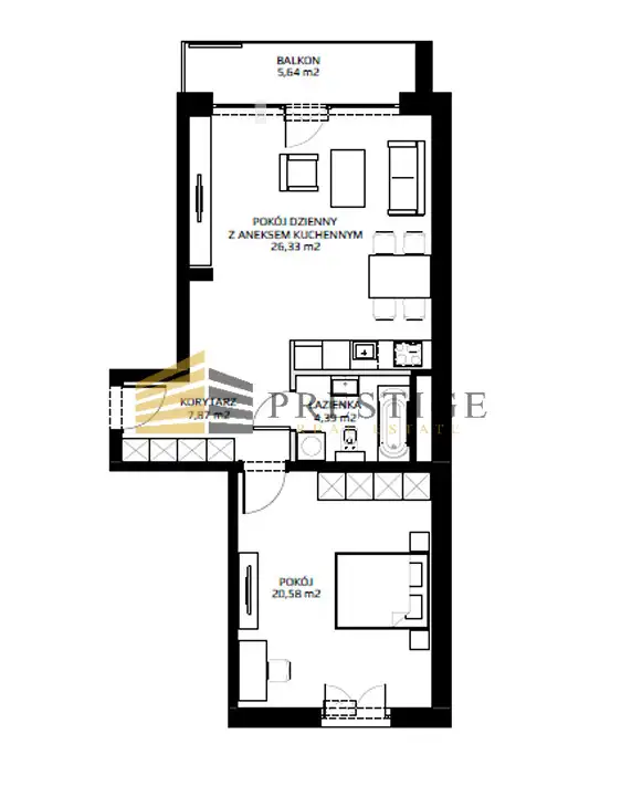 Salon z aneksem kuchennym – 28,19 m²Pokój (sypialnia) – 20,58 m²Łazienka – 5,11 m²Korytarz – 6,05 m²