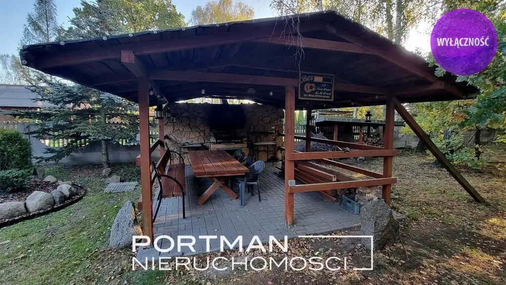 W zalesionej części działki znajduje się drewniana wiata z instalacja elektryczną o powierzchni 20m² (4mx5m) z kostka brukową oraz murowanym grillem/paleniskiem i murowaną ścianą pokrytą piaskowcem.