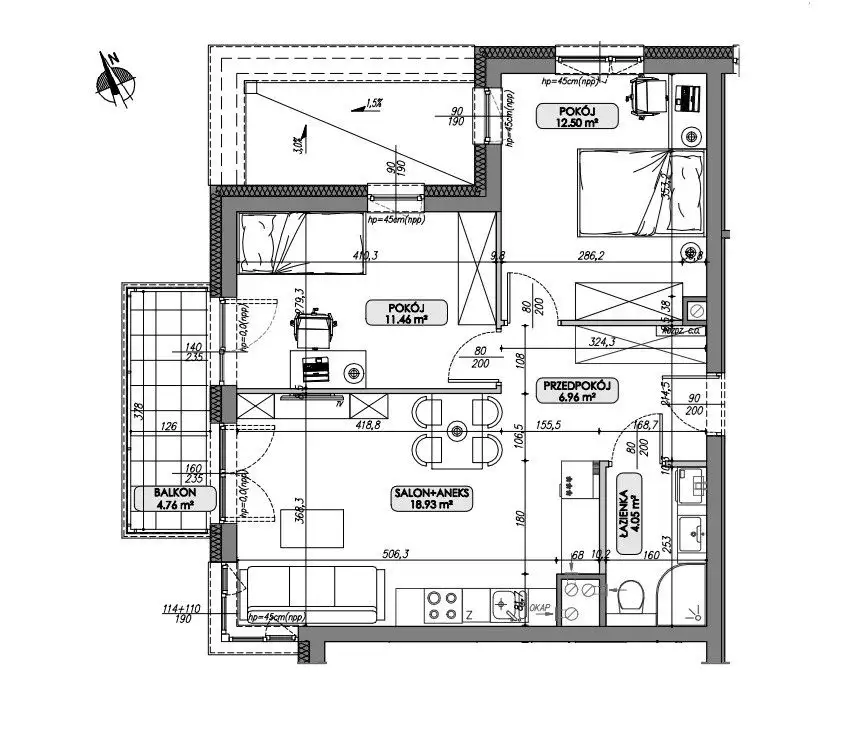 Pokój dzienny z aneksem kuchennym o pow. 18,93 m² z wyjściem na balkon o pow. 4,76 m²