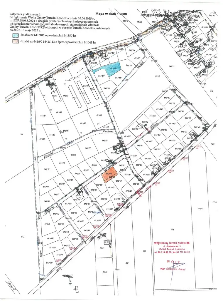 2) Nieruchomość niezabudowana, oznaczona w ewidencji gruntów i budynków jako działka nr 641/90 o powierzchni 0,0792 ha oraz działka nr 641/113 o powierzchni 0,0249 ha, położona w obrębie Turośń Kościelna przy ulicy Jarzębinowej, gmina Turośń Kościelna, powiat białostocki, województwo podlaskie, dla której w Sądzie Rejonowym w Białymstoku IX Wydział Ksiąg Wieczystych jest prowadzona księga wieczysta Kw. Nr BI1B/00049275/1. Działki te stanowiące zwarty kompleks gruntu o kształcie zbliżonym do trapezu przeznaczone są do łącznego zbycia, których powierzchnia łącznie wynosi 0,1041 ha. Położone są pośród gruntów rolnych z rozproszoną, nową zabudową mieszkaniową jednorodzinną. W odległości około 400 m w kierunku północny wschodnim znajduje się zwarta zabudowa wiejska, natomiast w odległości 1 km siedziba gminy i szkoła podstawowa. Działki są gruntem niezagospodarowanym zachwaszczonym i porośniętym kilkuletnim samosiewem brzozowym. Przylegają na północnym zachodzie do drogi gminnej – ul. Jarzębinowej o nawierzchni gruntowej w pasie której przebiegają sieci infrastruktury technicznej: wodociągowa, kanalizacji sanitarnej i elektryczna. Położone są w odległości około 200 m od drogi powiatowej (ulicy Leśnej) o nawierzchni asfaltowej oraz około 50 m od drogi gminnej (ulicy Akacjowej) o nawierzchni gruntowej.