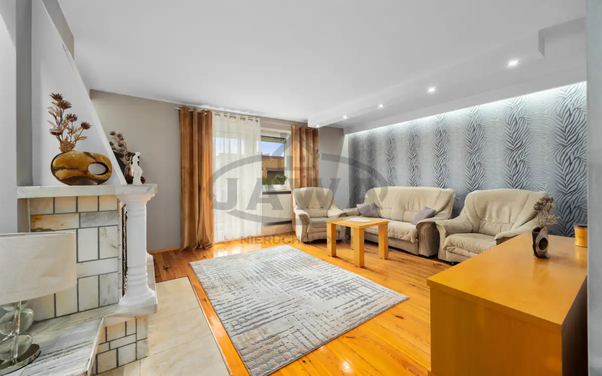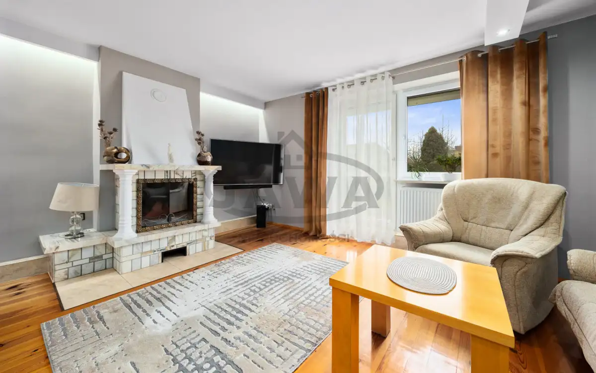 - Kominek: w salonie kominek, wokół którego znajduje się marmurowa obudowa