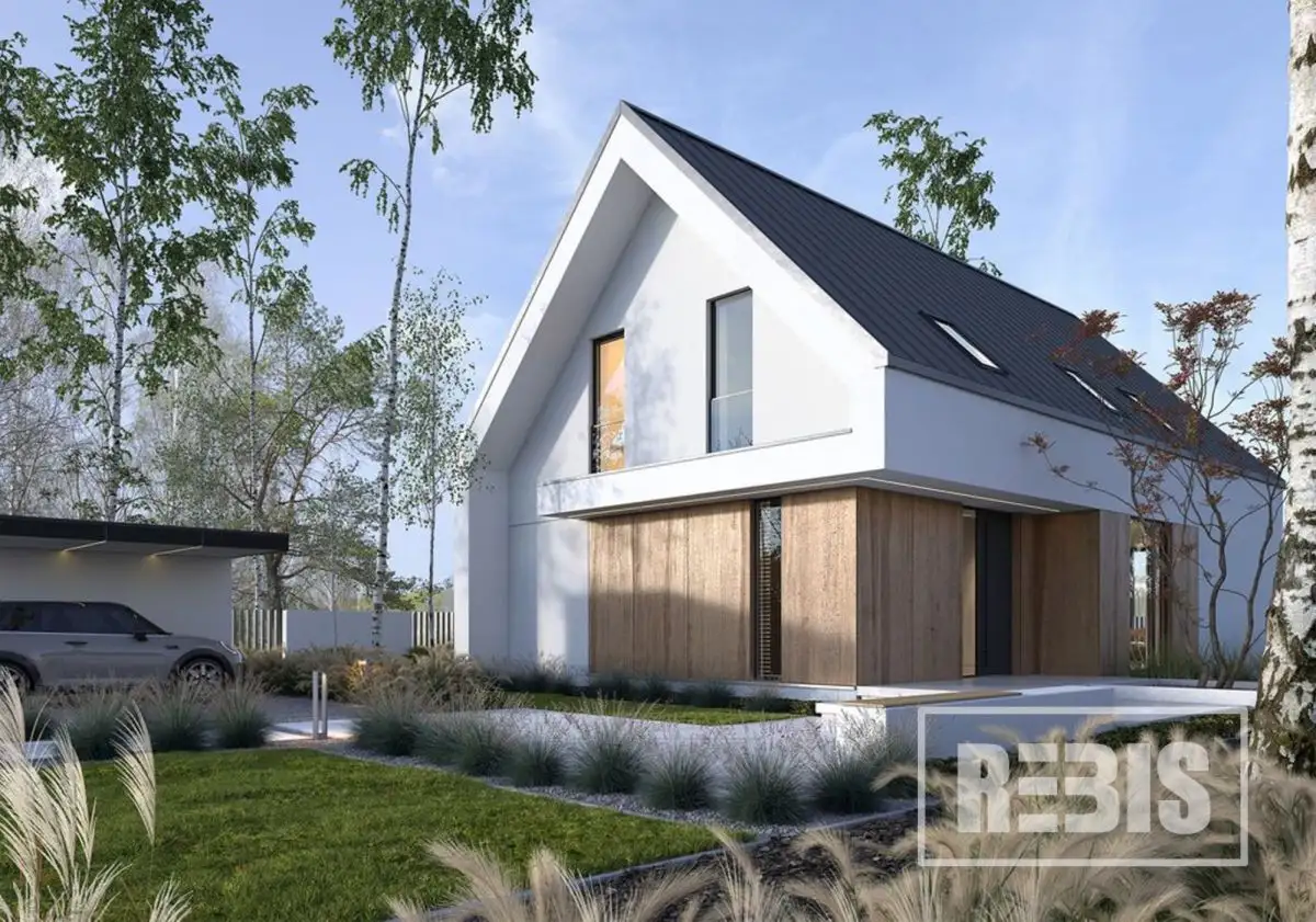 Projekt zakłada jasną elewację z ociepleniem oraz czarną dachówkę betonową, nadającą budynkom elegancki charakter.