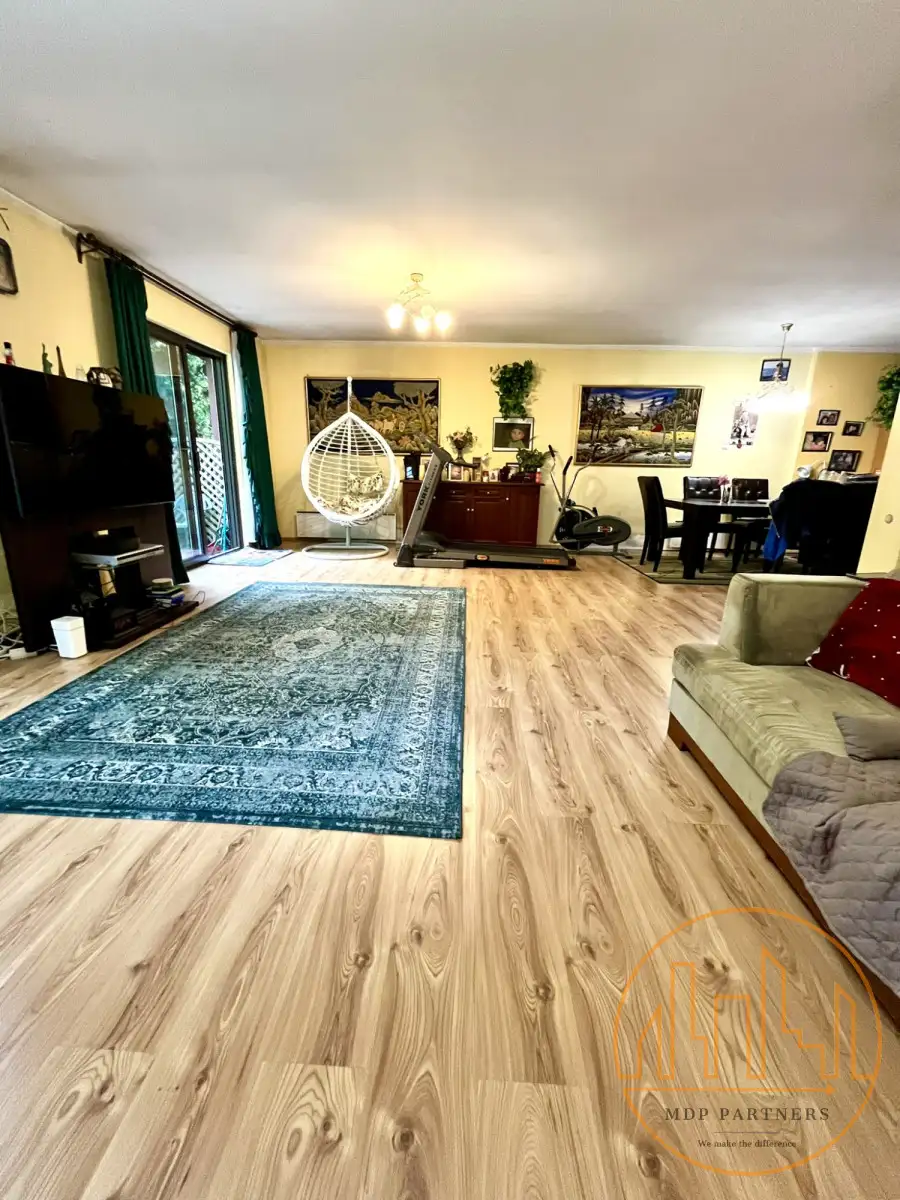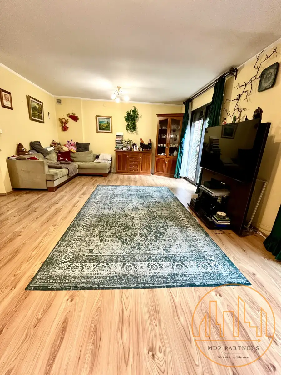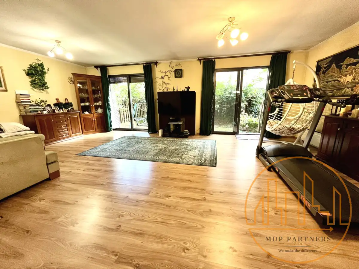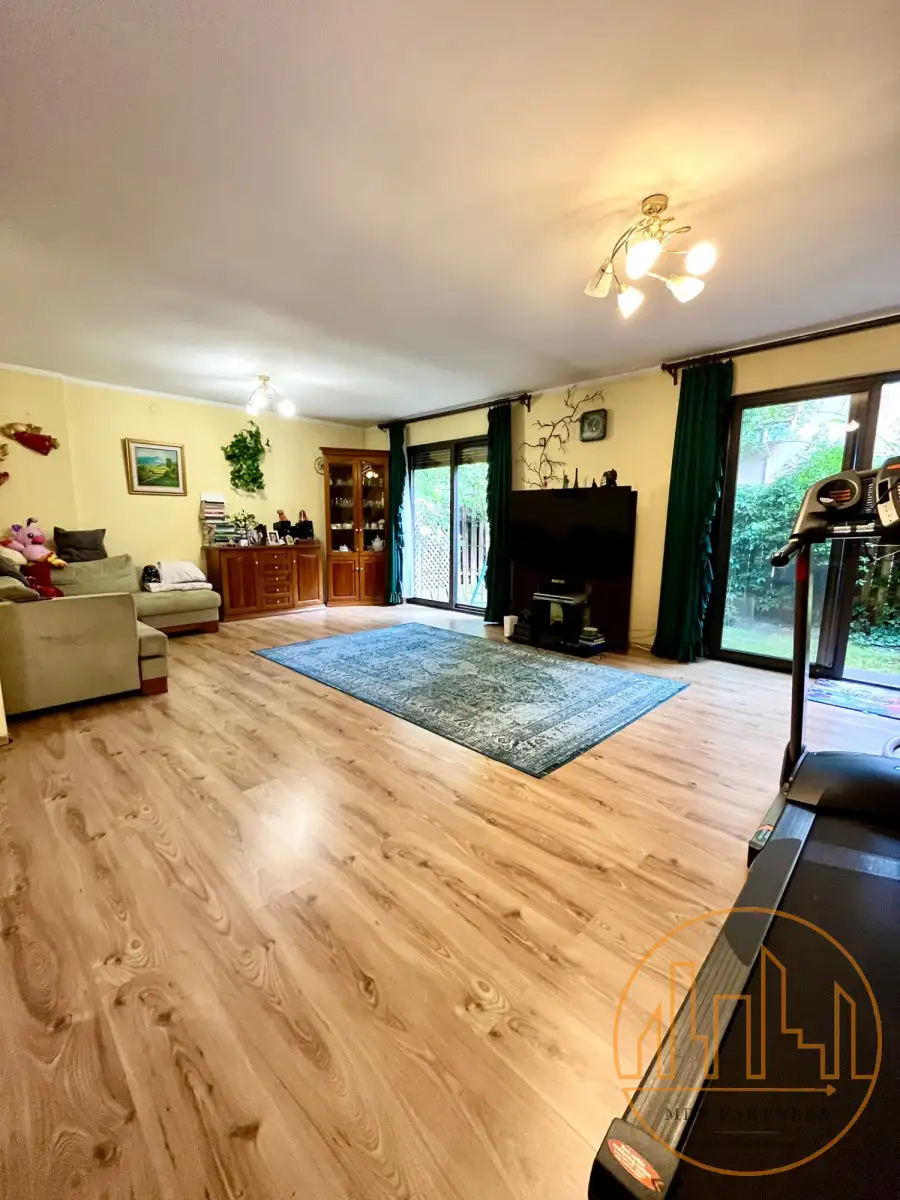 Przestronny salon (ok. 55 m²) z południową ekspozycją i wyjściem na ogródek (ok. 40 m²)