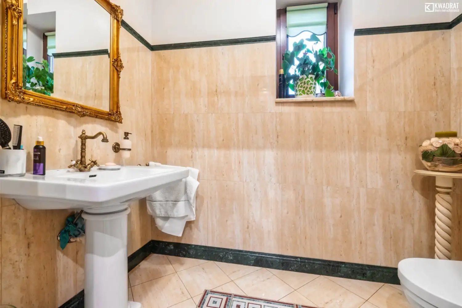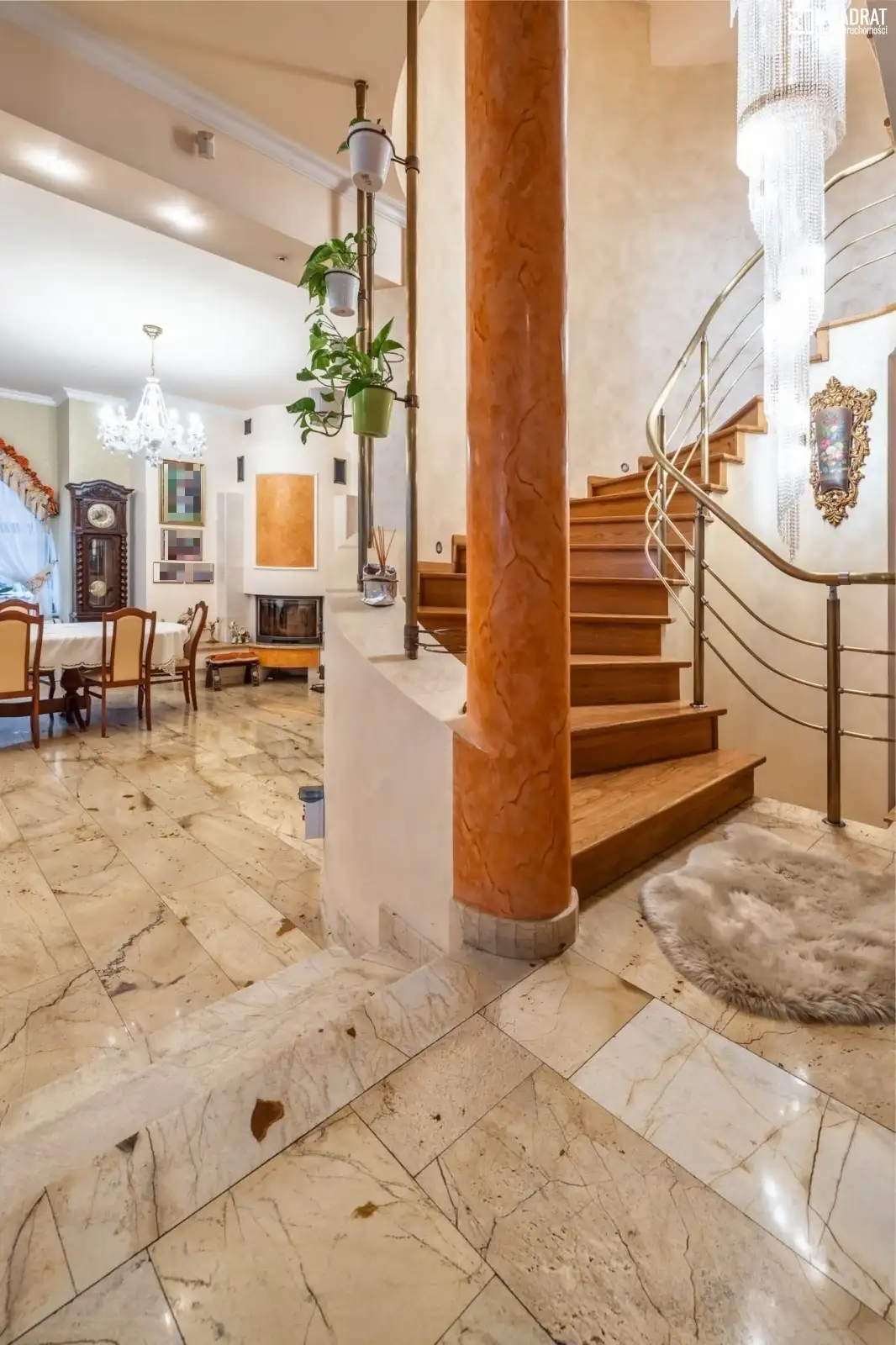 Podgrzewane podłogi na parterze wyłożone są najwyższej klasy marmurem. W sypialniach piękne drewniane parkiety, natomiast w garderobach wysokiej klasy gres. Kuchnia wyposażona w meble oraz pełny sprzęt AGD.