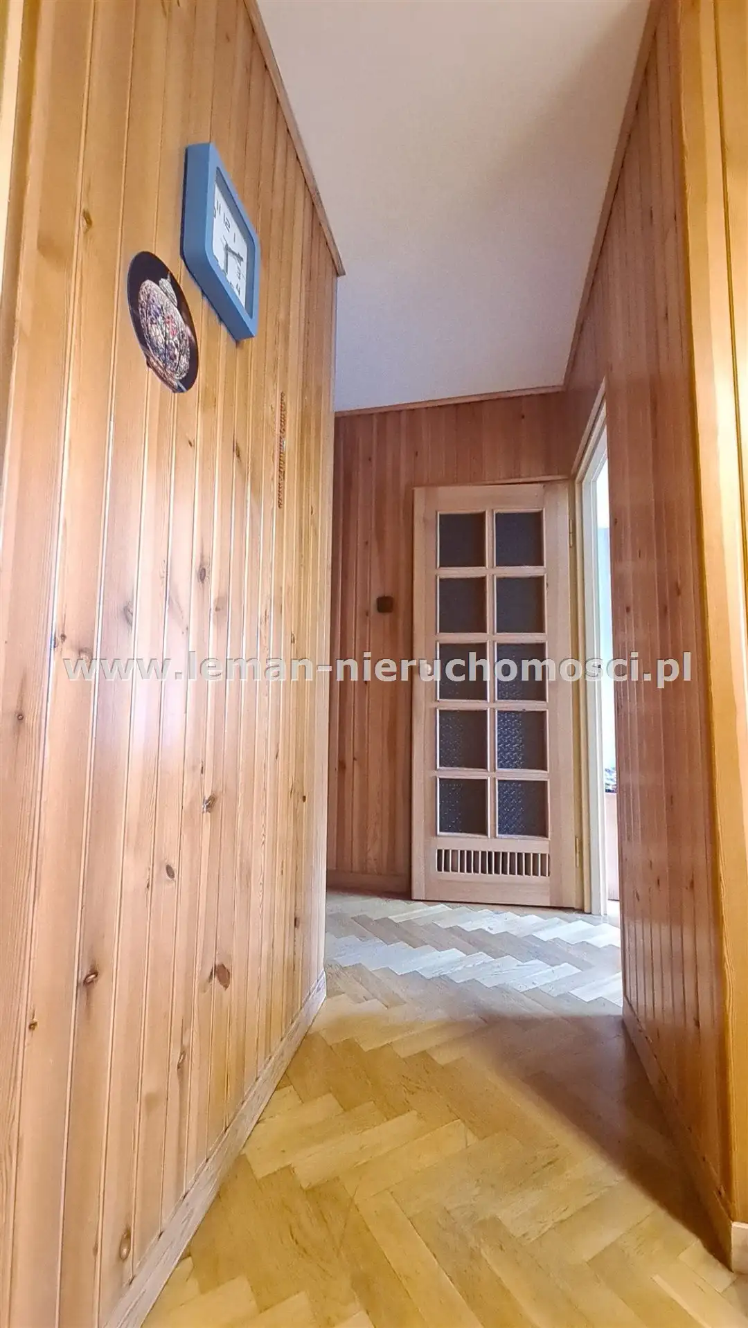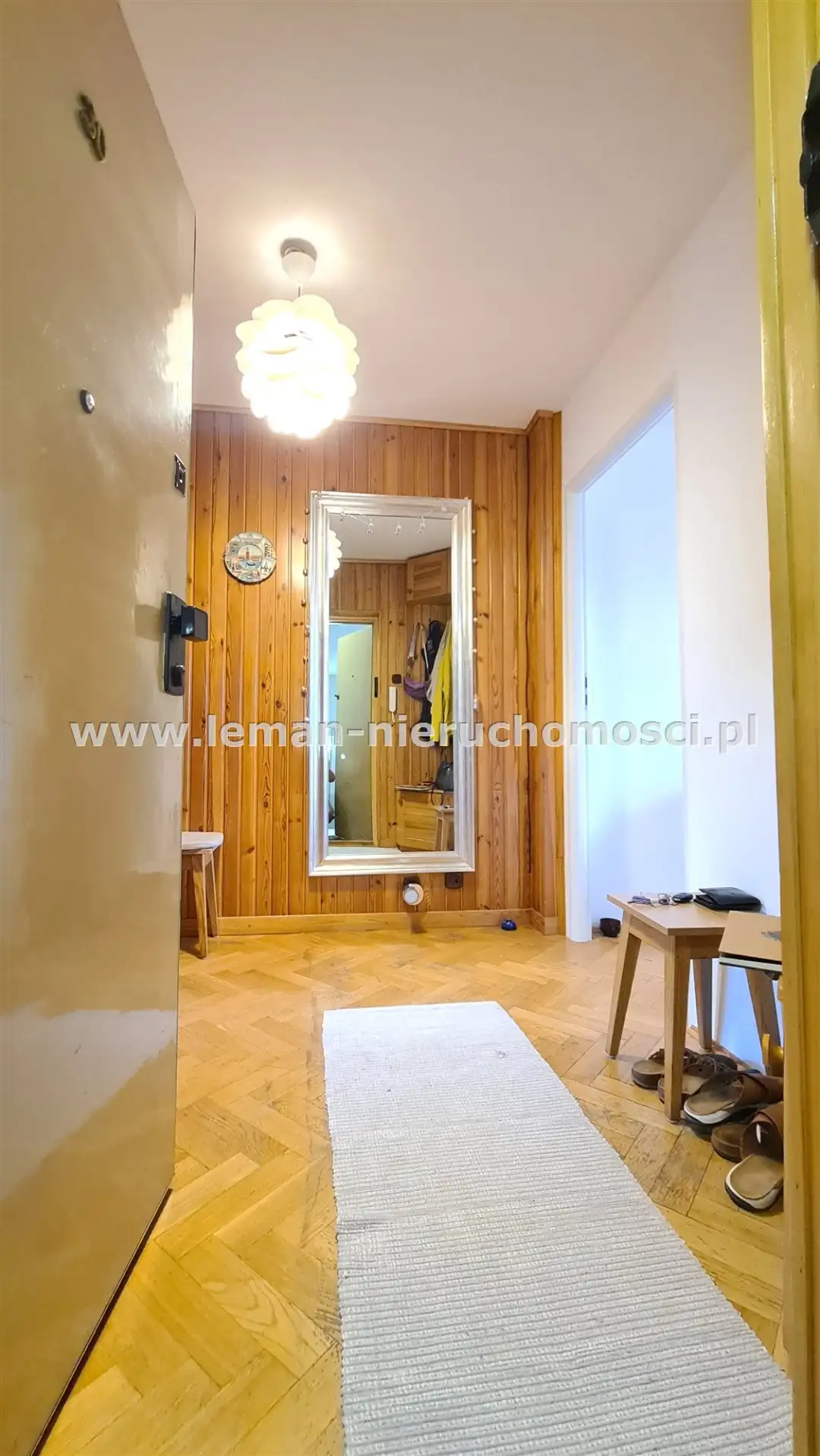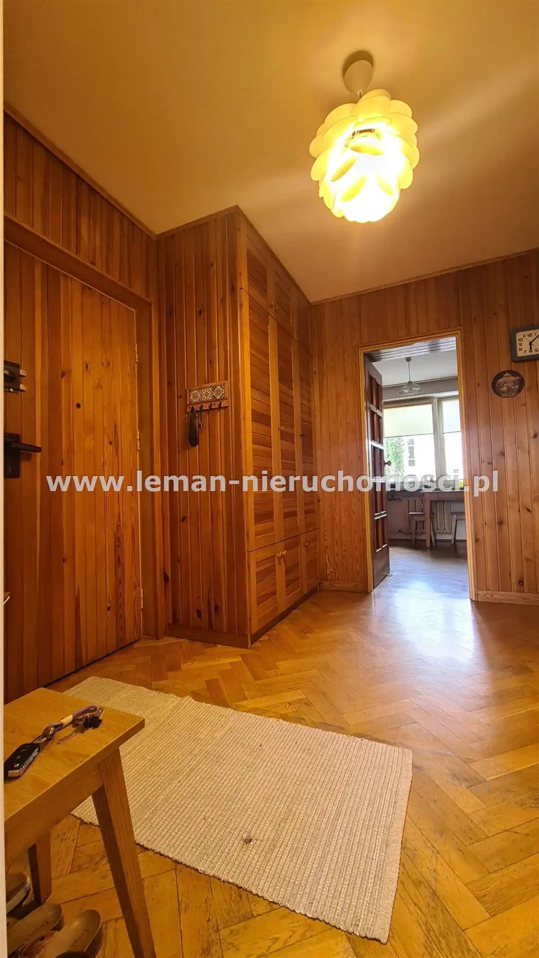 duży przedpokój wykończony dewnem, z wbudowaną 3-drzwiową, głęboką szafą