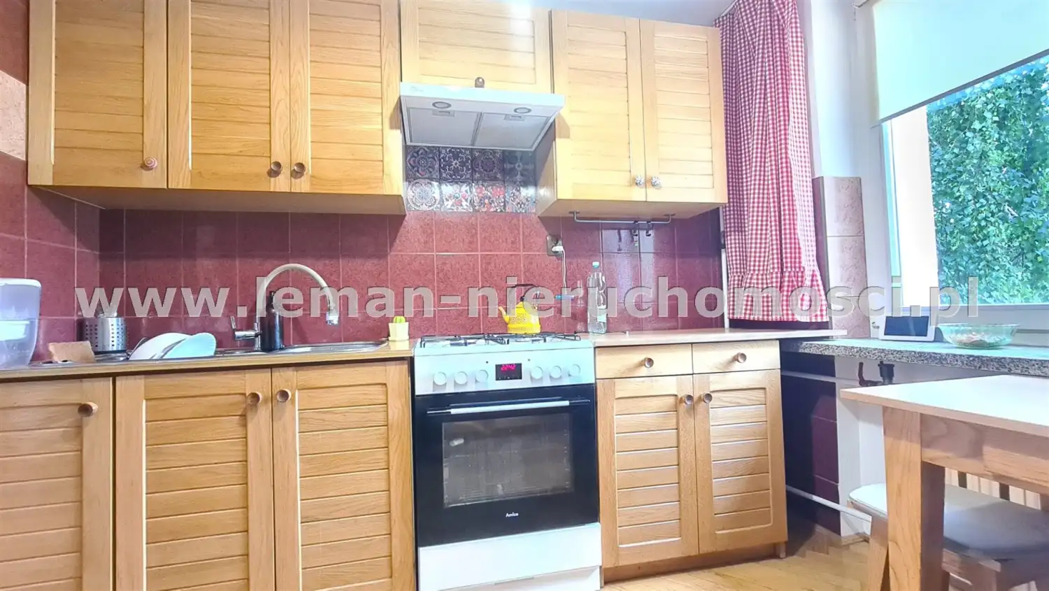 kuchnię z dwoma szeregami drewnianych szafek i stołem pośrodku; kuchenkę z piekarnikiem wymieniono ok. 3 lat temu