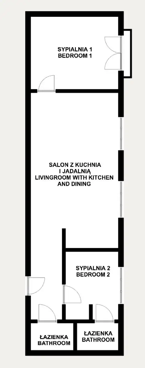 Pokoje: Sypialnia nr.1, sypialnia nr. 2, salon, otwarta kuchnia, korytarz, łazienka nr.1, łazienka nr. 2