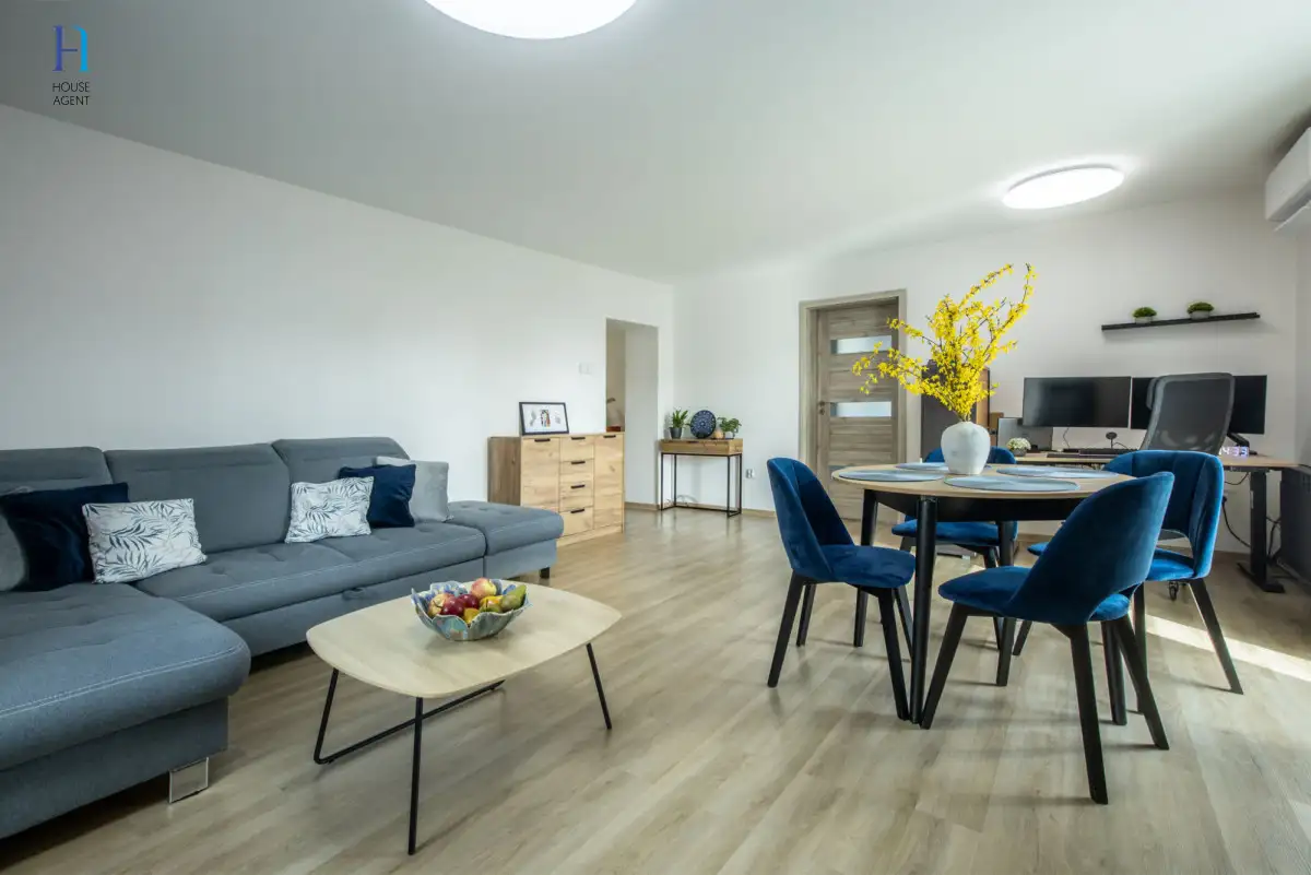 Mieszkanie o powierzchni 89,47 m² składa się z 3 pokoi, kuchni, oddzielnego WC oraz łazienki. Atutem tego