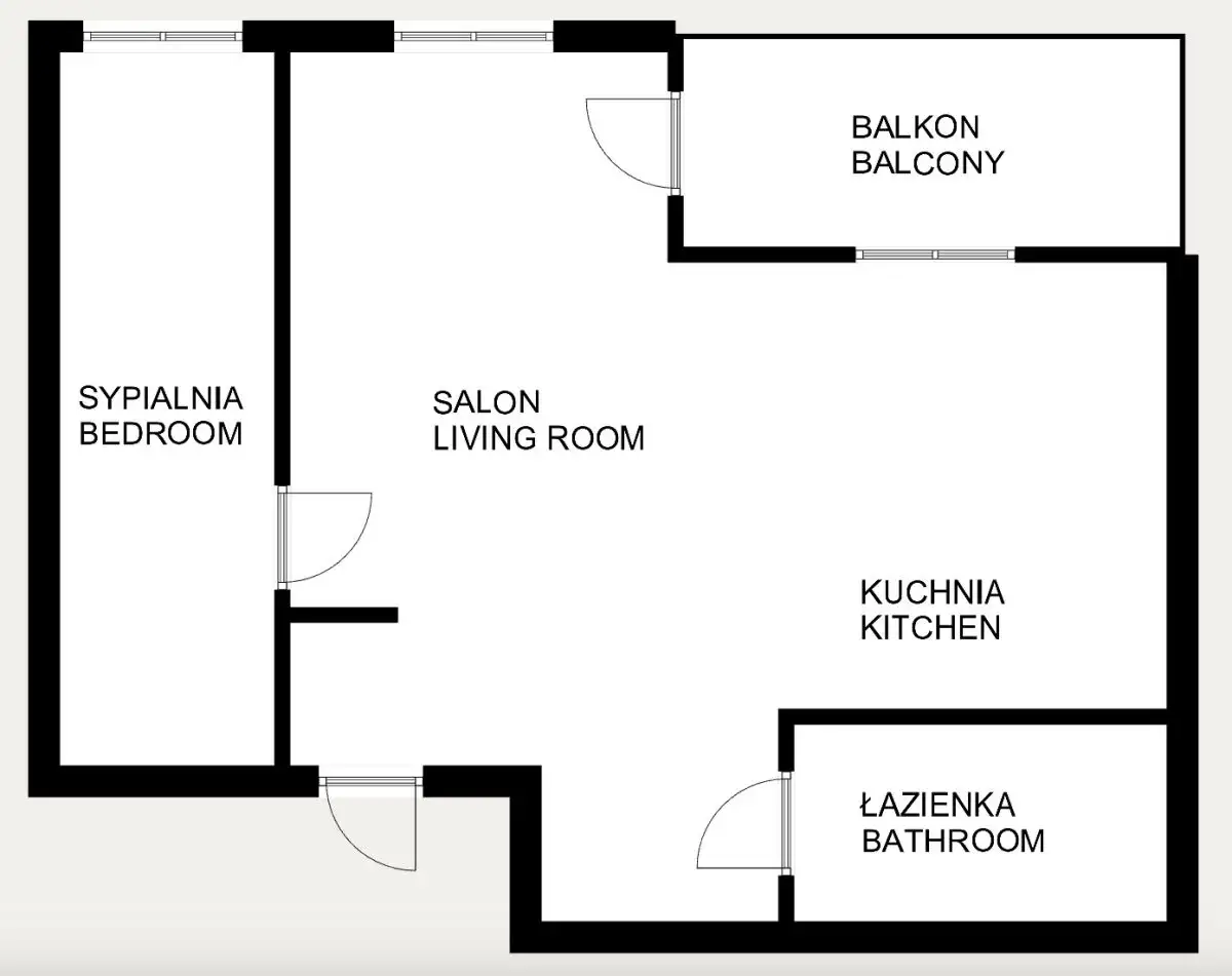 Pokoje: Sypialnia, salon, otwarta kuchnia, łazienka, balkon.