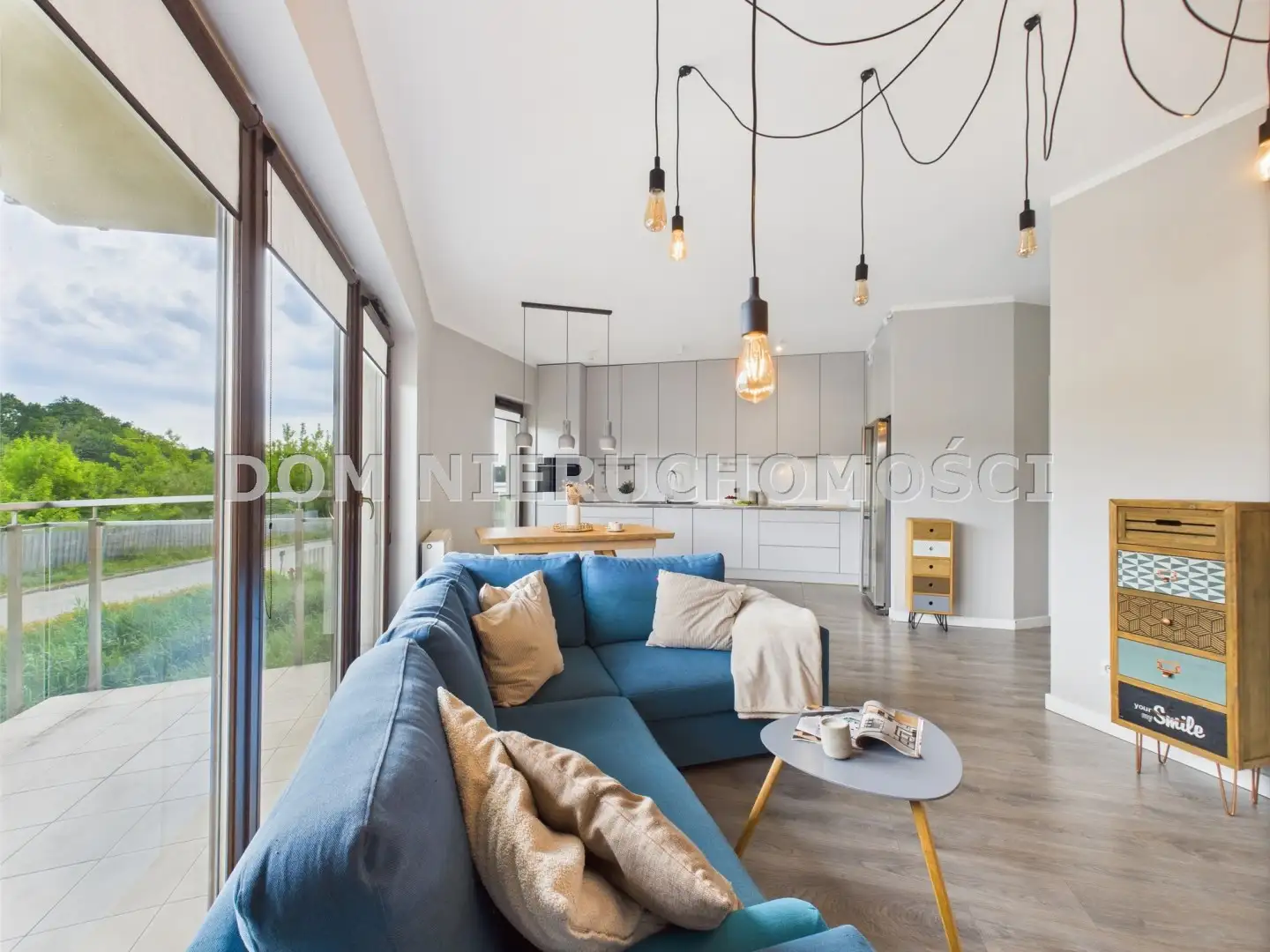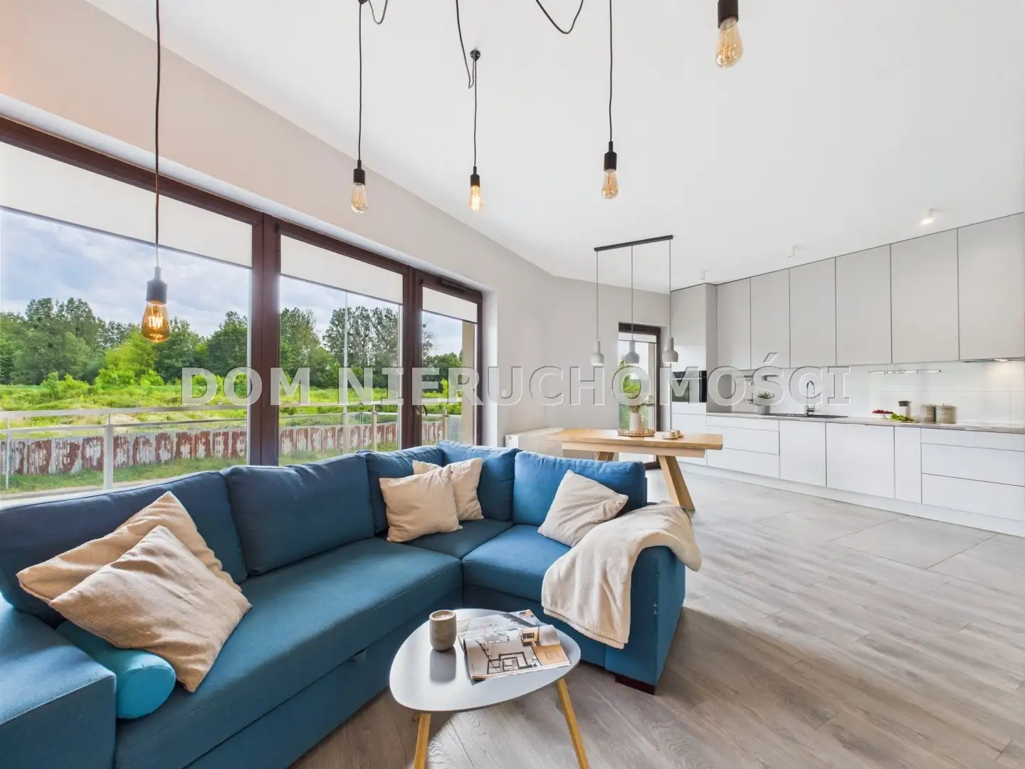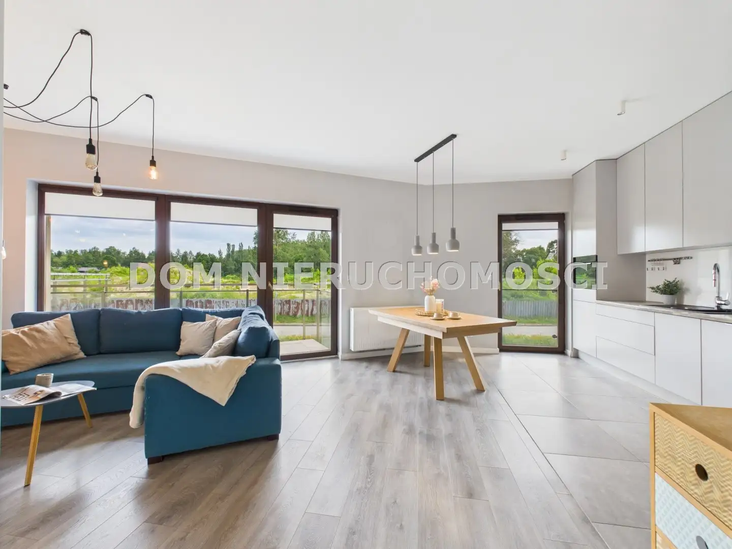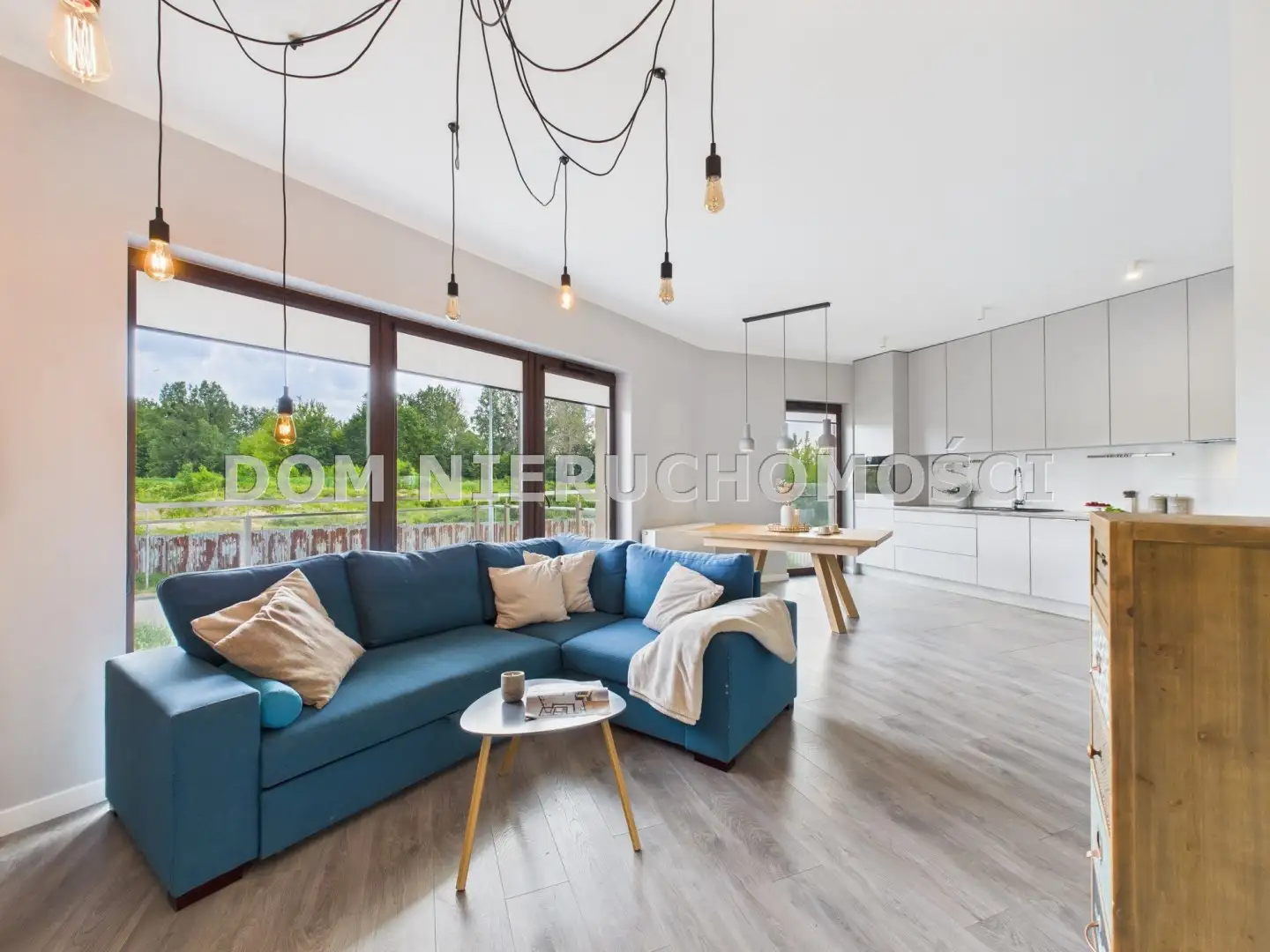 - z przestronnego salonu z aneksem kuchennym oraz bezpośrednim wyjściem na duży balkon z pięknym bocznym widokiem na Jezioro Kortowskie,
