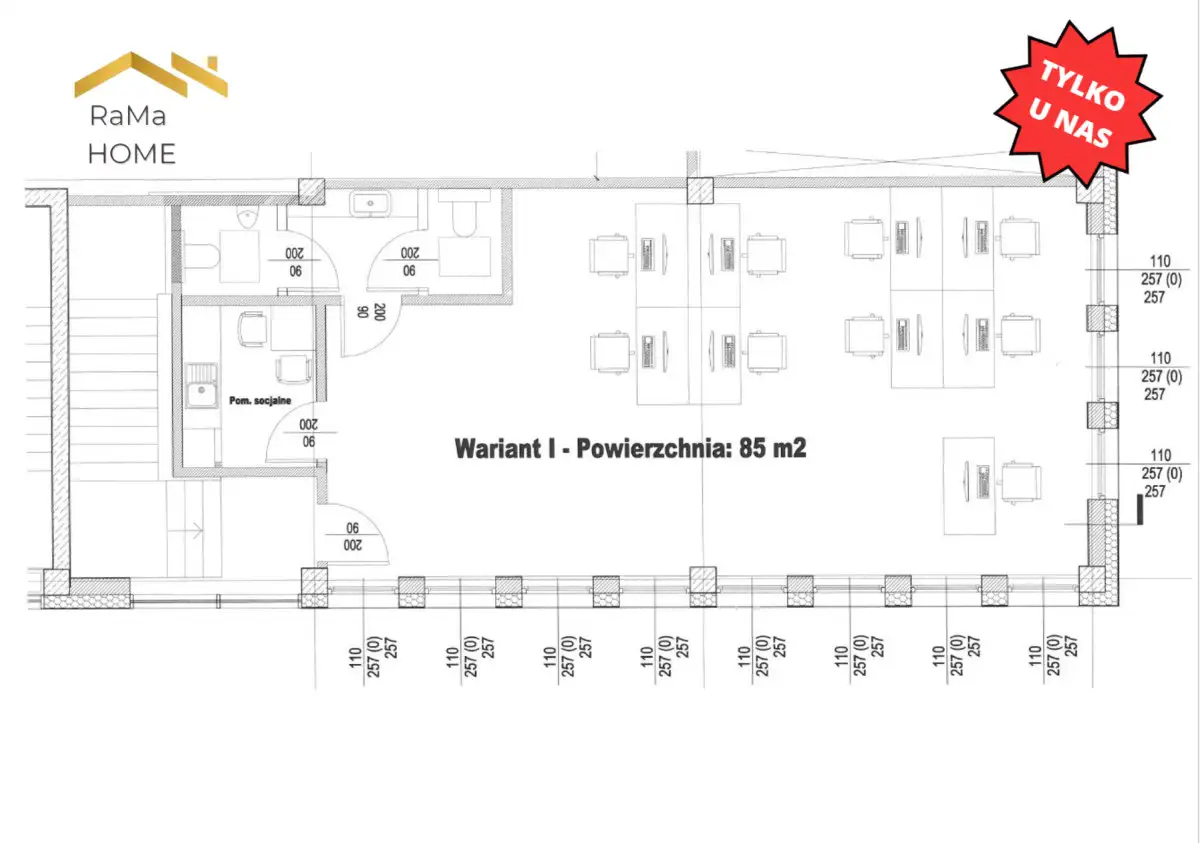 Opis Lokalu:Lokal usytuowany na pierwszym piętrze z niezależnym wejściem, o powierzchni 85 m² do własnej aranżacji z pomieszczeniem socjalnym i dwoma toaletami. Doskonałe miejsce do prowadzenia działalności usługowo-biurowej, idealne dla firm poszukujących nowoczesnych i komfortowych warunków pracy.