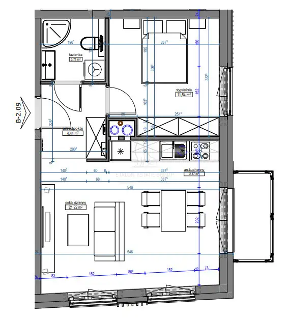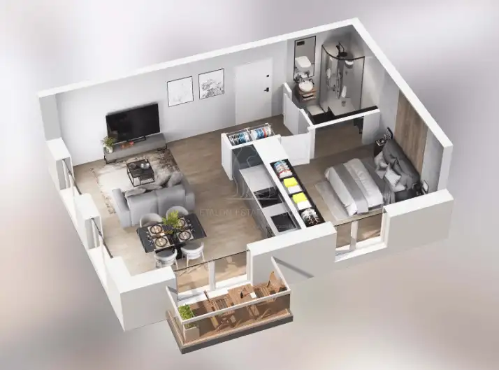 - salon z aneksem kuchennym, łazienka i wydzielona sypialnia