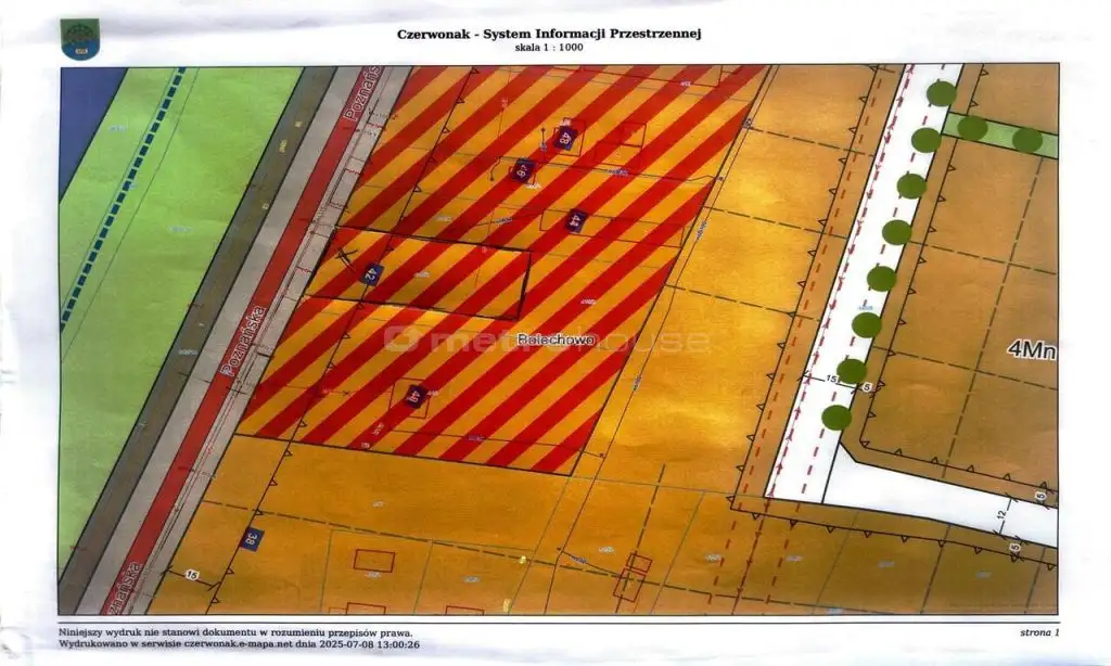 Teren z zabudową mieszkaniową, jednorodzinnąTeren usług i handlu. Budynki handlowe o powierzchni sprzedażowej nie większej niż 1000 m²Prowadzona działalność tylko w obrębie wyznaczonej działkiDziałka znajduje się na obszarze oznaczonym symbolem 4MUH. Odległość nowych budynków od linii rozgraniczającej pas drogowy powinna wynosić 15 mGaraże dla samochodów mogą być integralną częścią budynków mieszkalnych lub wolno stojąceMaksymalna wysokość budynków 12 mDachy strome o nachyleniu 3045°, pokryte dachówką lub materiałem dachówko podobnymDopuszcza się łączenie poszczególnych działek pod warunkiem, że projektowane budynki powstaną zgodnie z naniesionymi na rysunku liniami zabudowyOgrodzenie działki, ażurowe w minimum 60% powierzchni o maksymalnej wysokości 150 cm od poziomu terenu. Zakaz budowania ogrodzenia w formie litego muru.Minimum 30% powierzchni biologicznie czynnejZalety