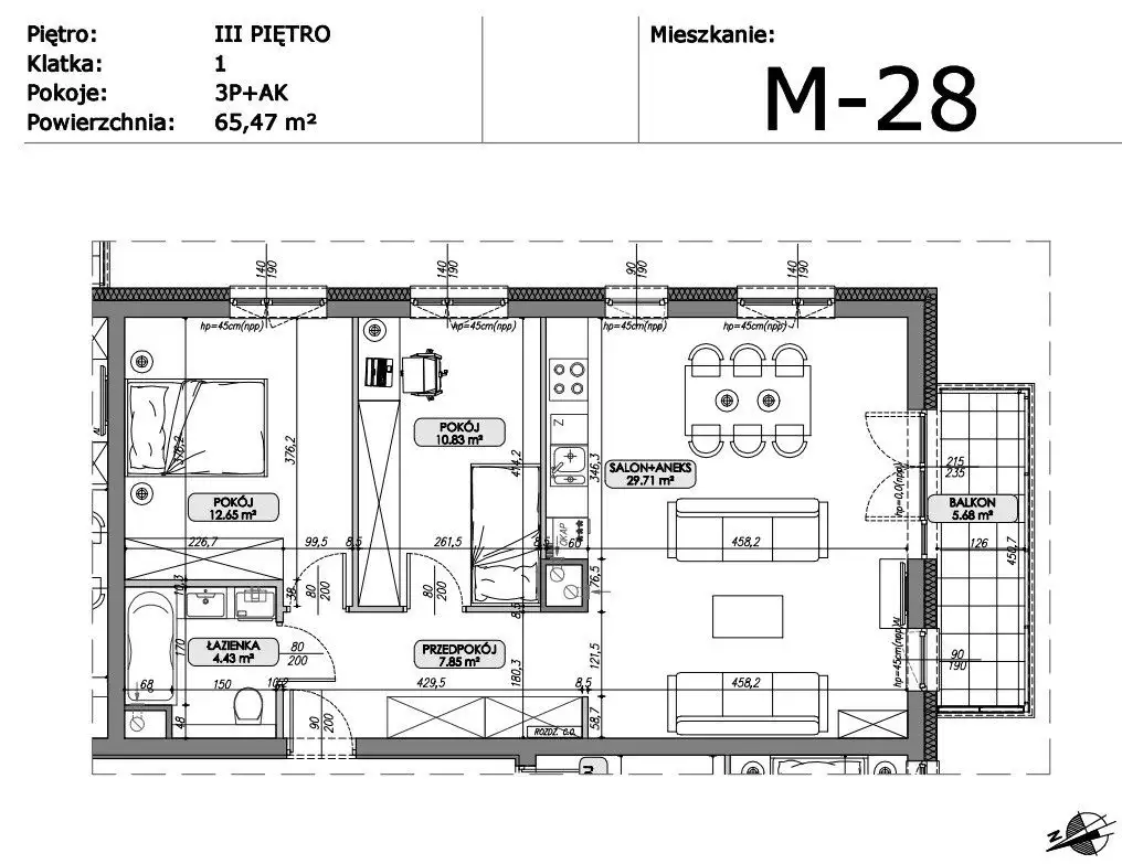 Trzypokojowe mieszkanie o powierzchni projektowej 65,47 m² położone na trzecim piętrze w budynku z wystawą okien na zachód i północ.