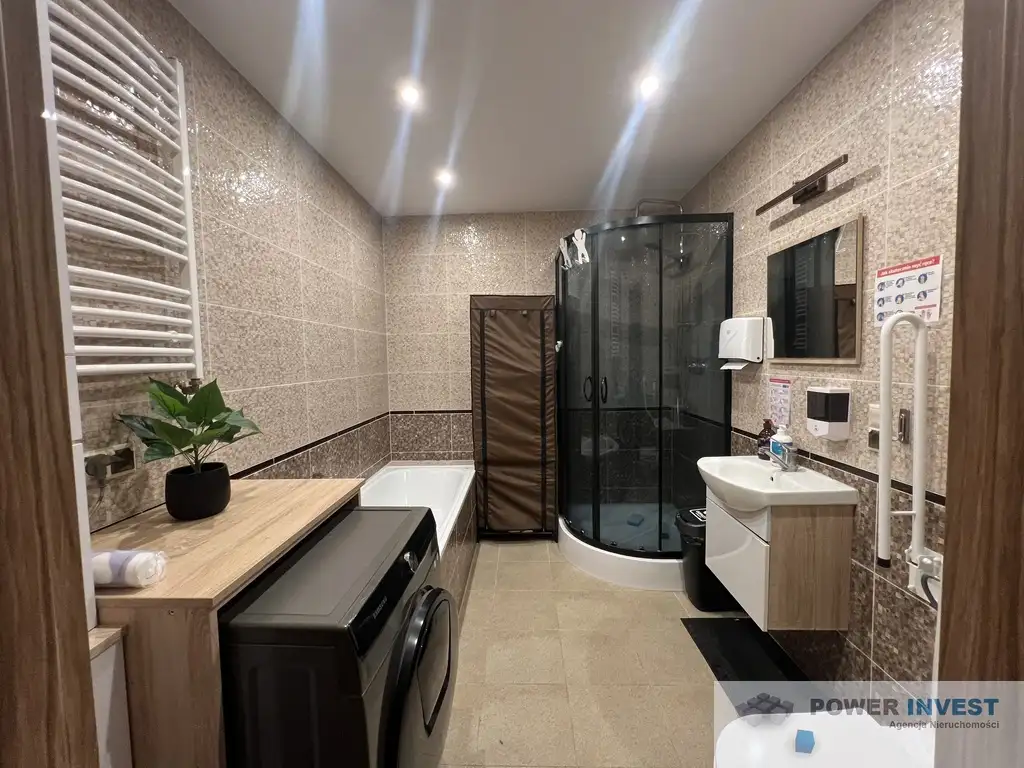 -Przestronna łazienka w odcieniach miedzi – wyposażona w dużą wannę, prysznic oraz pralko-suszarkę.