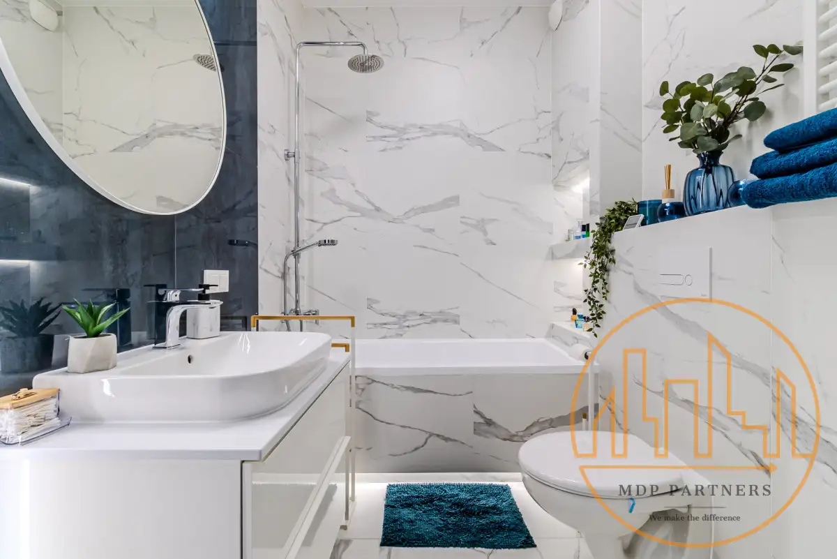 • Łazienka (4 m²)Stylowo wykończona w odcieniach bieli i granatu, z wanną z funkcją prysznica, umywalką i podwieszanym WC.