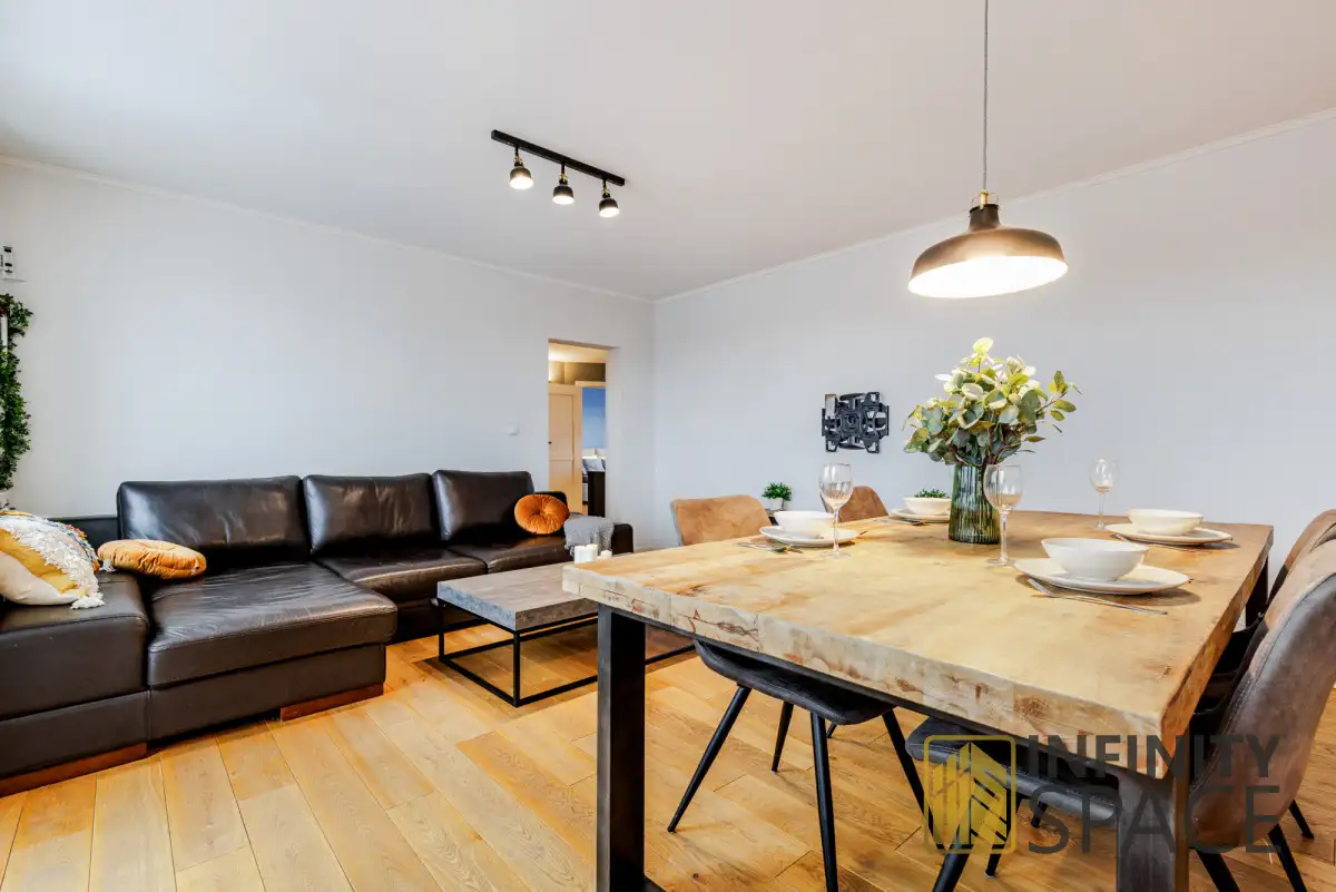 THREE-BEDROOM APARTMENT OF 80 m² | MODERN KITCHEN | NEAR "LASEK NA KOLE" FLATElegant and modern flat of 80 m² is located on the fourth floor of an intimate four-storey building. It is after general renovation and replacement of all installations (2021). The interior of the flat has been designed with attention to every detail, ensuring functionality and aesthetics. High-end appliances have been installed in the kitchen. Wooden floors add warmth and soundproofed windows guarantee peace and privacy. The flat has an extremely functional layout, is very bright (south-west exposure) and spacious. The balcony is protected by a cat net.