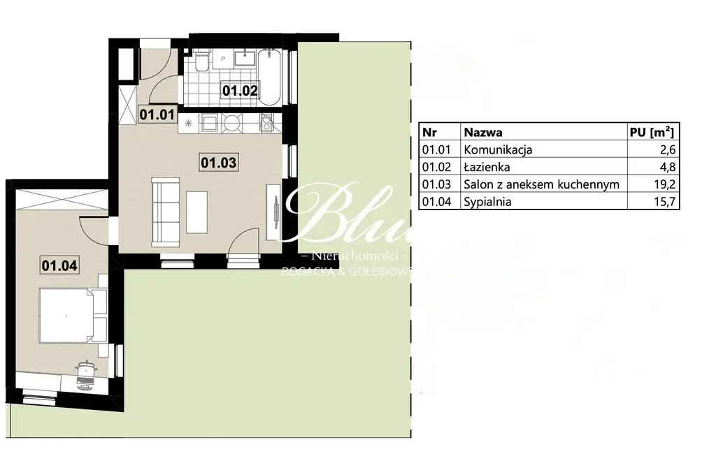 Blue Real Estate is proud to present an attractive 42.3 m² apartment located on the ground floor of a modern residential development designed with comfort in mind,