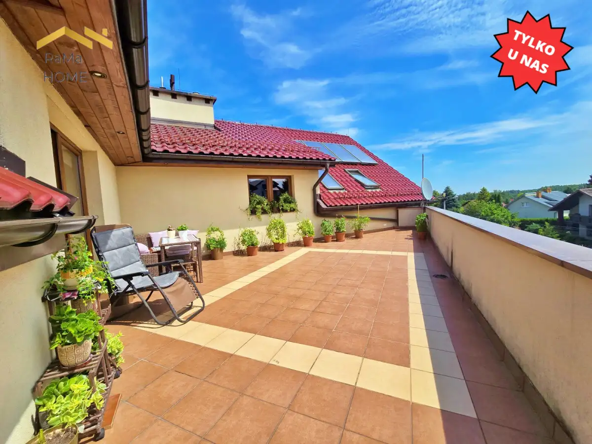 - Duży salon z dwoma wyjściami na taras (częściowo zadaszony)