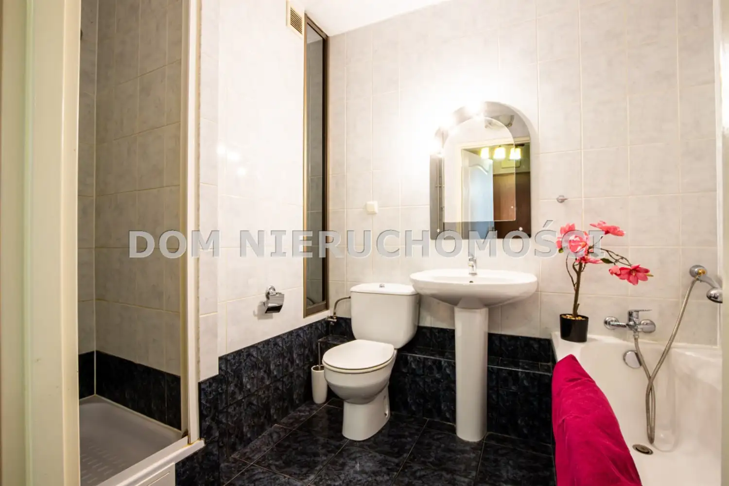 - łazienka razem z WC, wyposażona w pralkę, kabinę prysznicową i wannę,