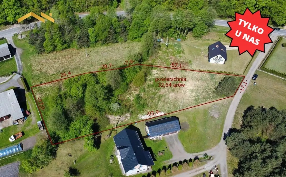 Kształtem zbliżona do trapezu, nieregularna, zwężająca się w kierunku drogi dojazdowej, niemniej pozostaje na tyle szeroka że duży dom jednorodzinny lub  budynek mieszkalny znajdzie swoje miejsce na działce bez problemu.