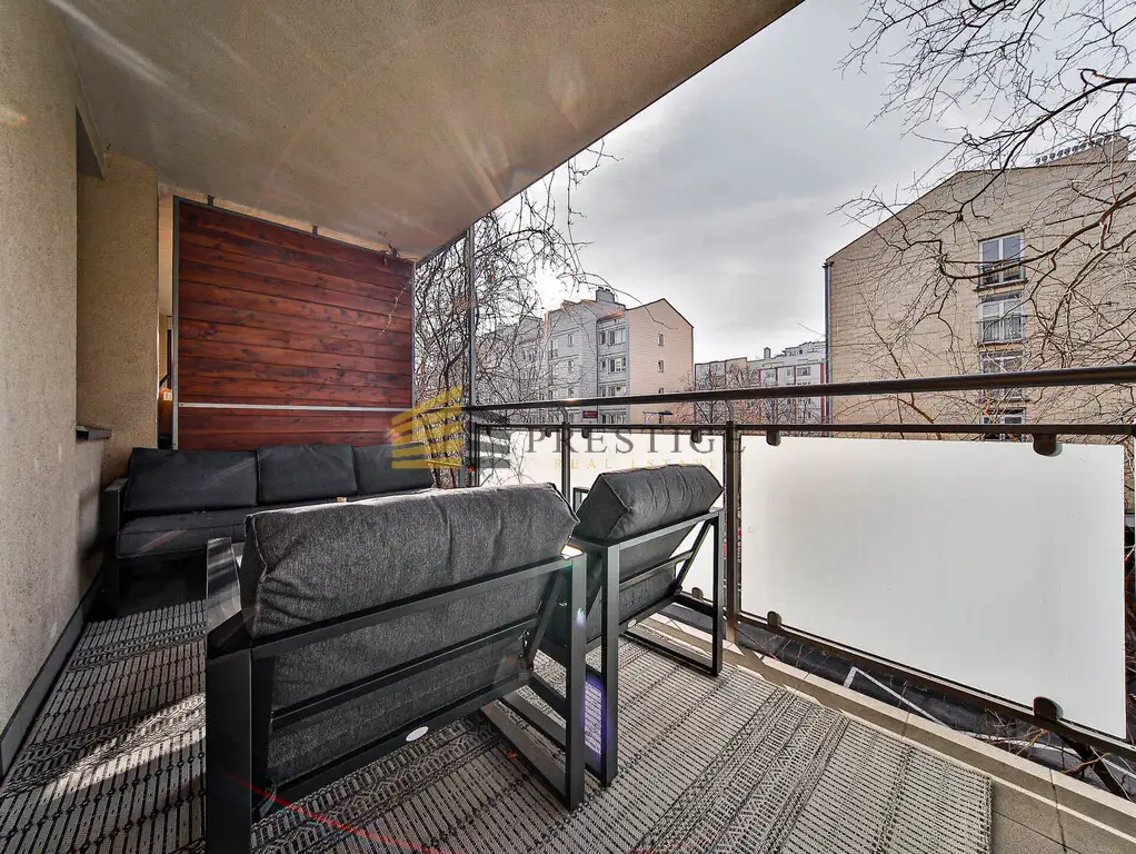 A modern apartment located among greenery next to the University of Warsaw Library.