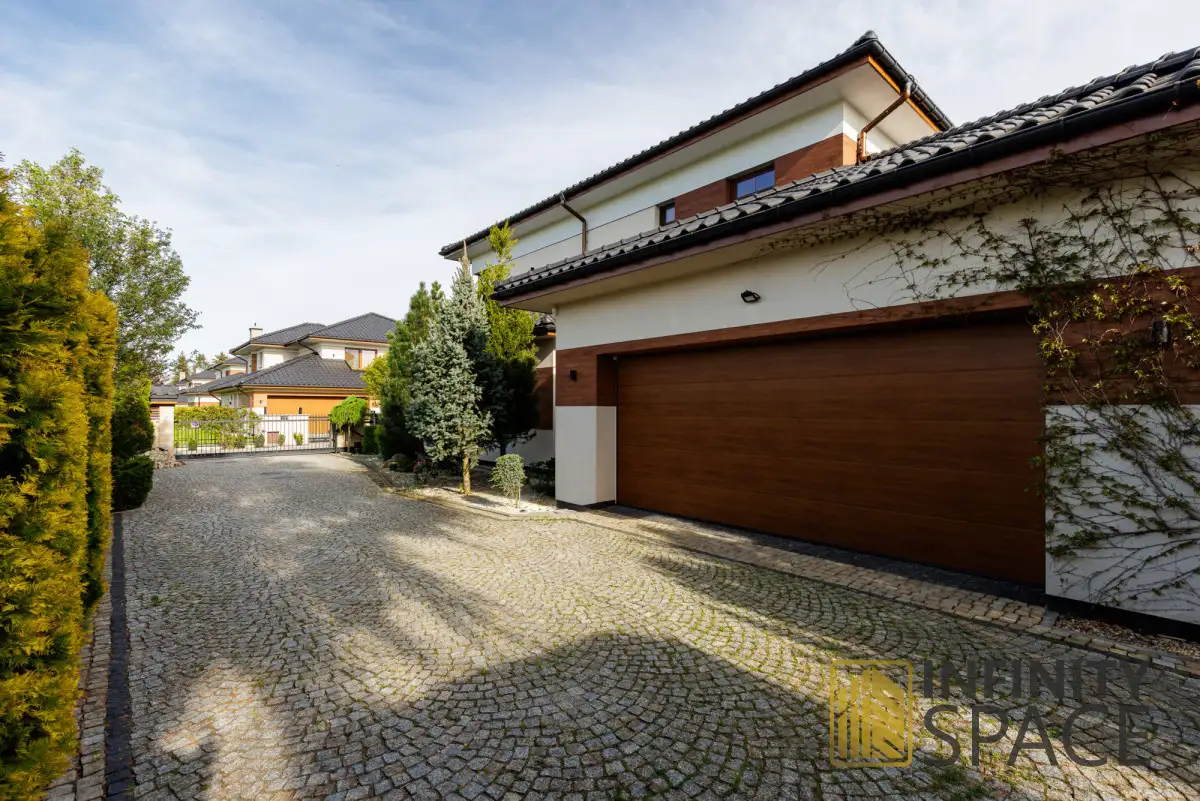 |||| Działka i otoczenie zewnętrzne ||||Dom wybudowano na działce o powierzchni 1202 m², z czego około 750 m² jest zagospodarowane na pięknie urządzony i utrzymany ogród oraz zieleń. Cała zieleń jest podlewana automatycznie. Można to wykonywać zarówno z sieci wodociągowej jak i wody deszczowej, na którą przygotowano podziemny zbiornik o objętości 10 m3. Teren nieruchomości jest ogrodzony, a wjazd na posesję odbywa się przez zdalnie sterowana bramę przesuwną. Przed budynkiem znajduje się także wyłożony kostką granitową podjazd, na którym w przypadku odwiedzin można zaparkować kilka dodatkowych samochodów. W rogu działki znajduje się także niewielki drewniany domek narzędziowy pozwalający na przechowywanie przyborów ogrodniczych lub drewna do kominka. Całe zewnętrzne otoczenie jest zaprojektowane spójnie i utrzymane w dobrej kondycji.