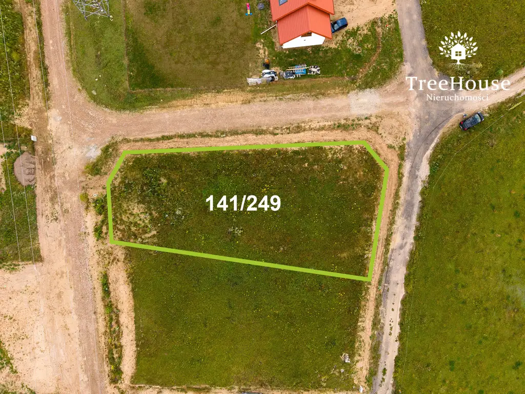 Działka o numerze ewidencyjnym 141/249 ma powierzchnię 1003 m², posiada regularny kształt i płaską powierzchnię, co znacznie ułatwia projektowanie budynku i zagospodarowanie przestrzeni wokół domu.