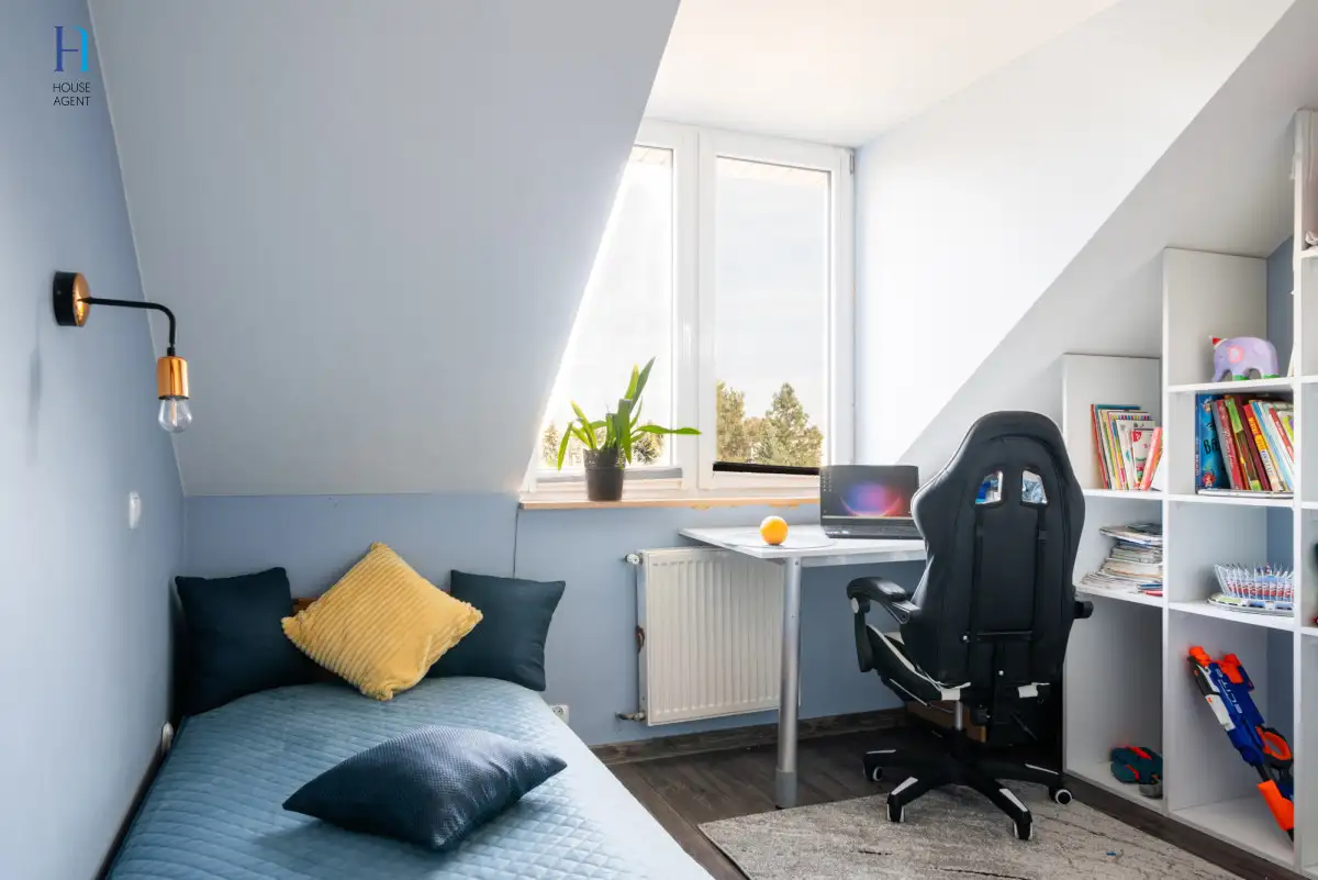 Na drugim piętrze znajdziesz sypialnię, łazienkę oraz trzy dodatkowe pokoje.
