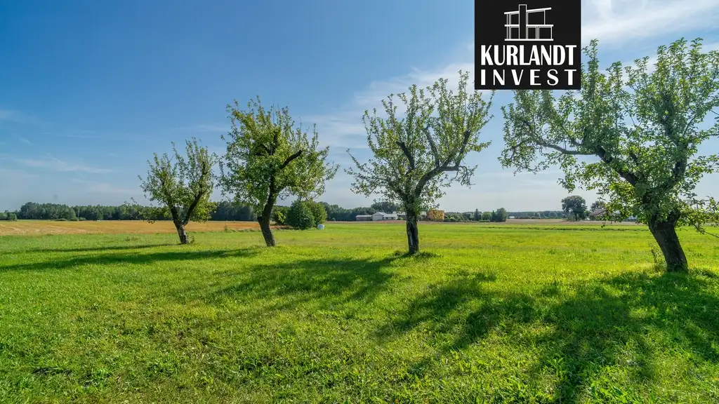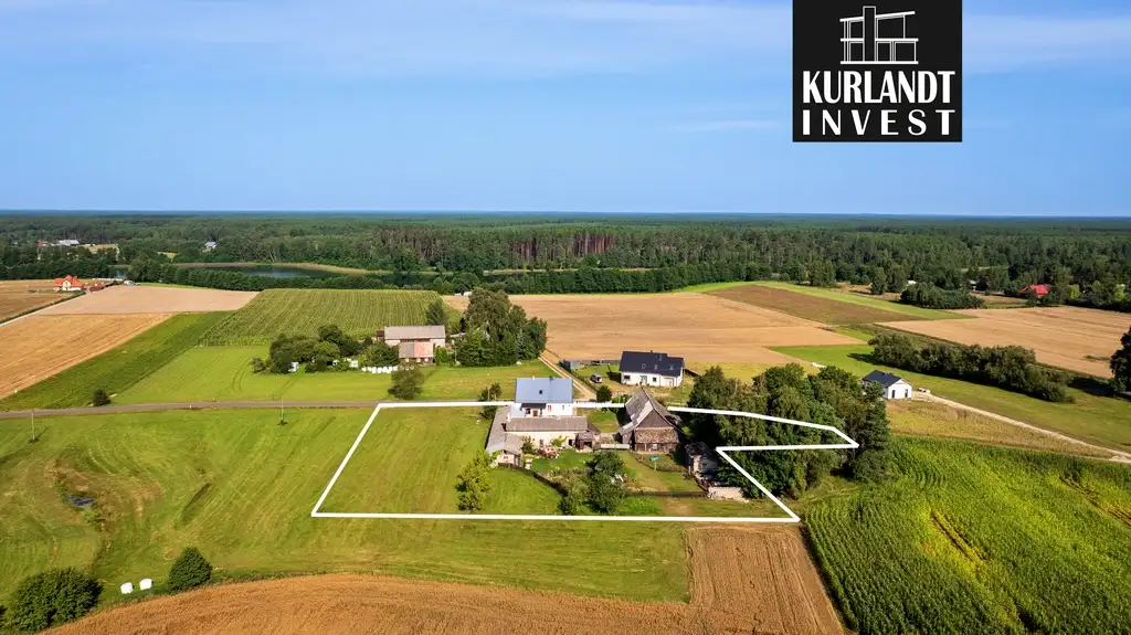 Działka o powierzchni 5.433 m² jest otoczona polami i lasami, w pełni nasłoneczniona, z dojazdem drogą asfaltową bezpośrednio przy nieruchomości.