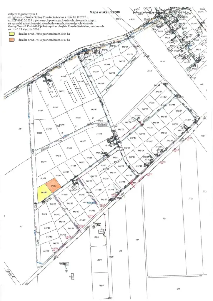 2) Nieruchomość niezabudowana, oznaczona w ewidencji gruntów i budynków jako działka nr 641/81 o powierzchni 0,1040 ha, położona w obrębie Turośń Kościelna, gmina Turośń Kościelna, powiat białostocki, województwo podlaskie, dla której w Sądzie Rejonowym w Białymstoku IX Wydział Ksiąg Wieczystych jest prowadzona księga wieczysta Kw. Nr BI1B/00049275/1. Działka ma kształt zbliżony do prostokąta, dogodny do zagospodarowania. Położona jest pośród gruntów rolnych z rozproszoną nową zabudową mieszkaniową jednorodzinną. Wzdłuż przyległej do niej drogi rozprowadzone są sieci: wodociągowa i kanalizacyjna. W odległości około 1,5 km znajduje się szkoła podstawowa, urząd gminy oraz ośrodek zdrowia.