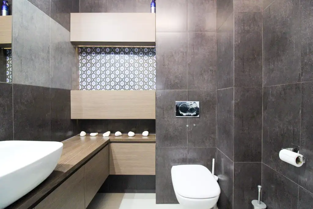 W łazience: prysznic, nablatowa umywalka, pralka Samsung, funkcjonalne szafki
