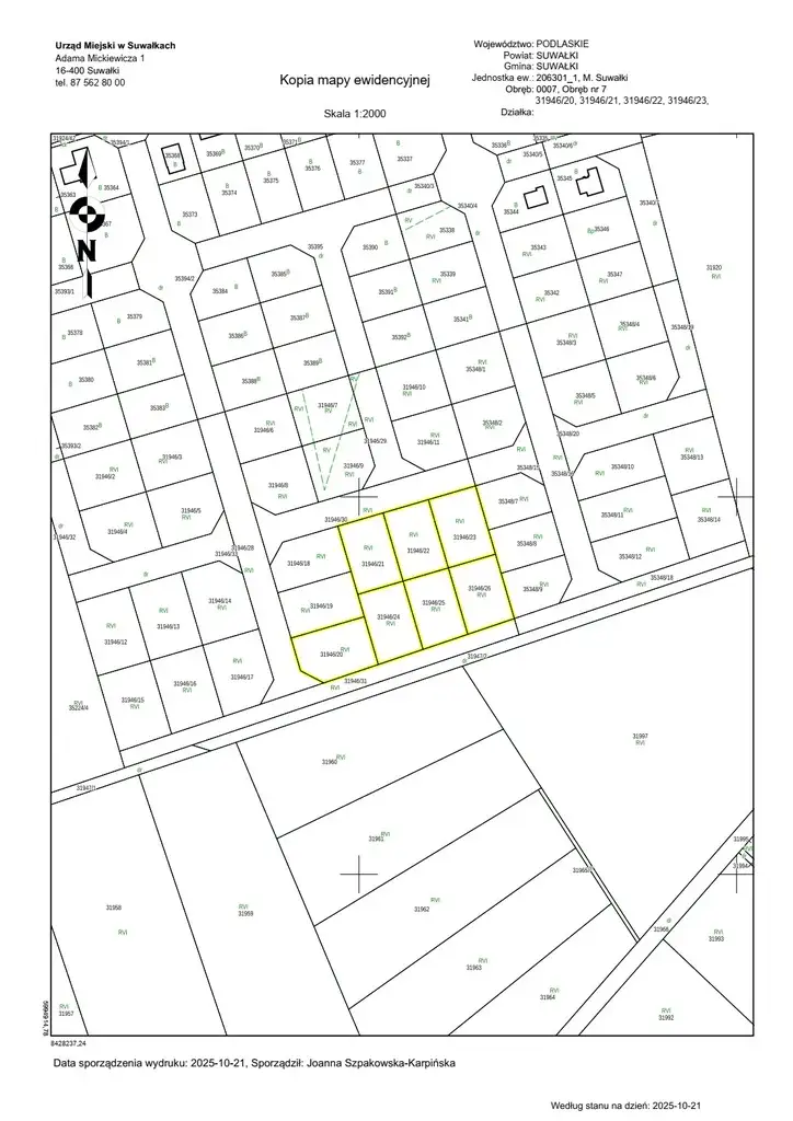 7. Oznaczona działką nr 31946/26 o powierzchni 0,0938 ha, niezabudowana, położona w Suwałkach w Obrębie nr 7, wchodząca w skład nieruchomości oznaczonej księgą wieczystą nr SU1S/00031671/3. Działka zgodnie z miejscowym planem zagospodarowania przestrzennego południowo - zachodniego rejonu ulicy Zastawie w Suwałkach zatwierdzonym Uchwałą LXVI/871/2024 Rady Miejskiej w Suwałkach z dnia 31.01.2024 roku, objęta jest konturem 7MNW - teren zabudowy mieszkaniowej jednorodzinnej wolnostojącej. Nieruchomość przeznaczona jest do sprzedaży w drodze przetargu ustnego nieograniczonego.