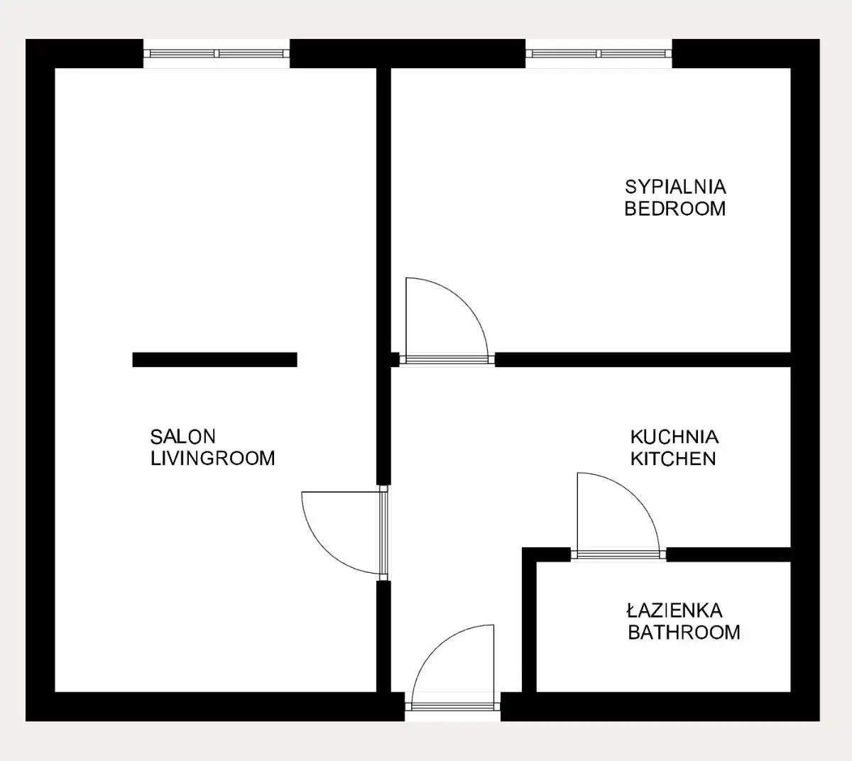 Pokoje: salon z wydzieloną sypialnią, sypialnia, kuchnia, łazienka