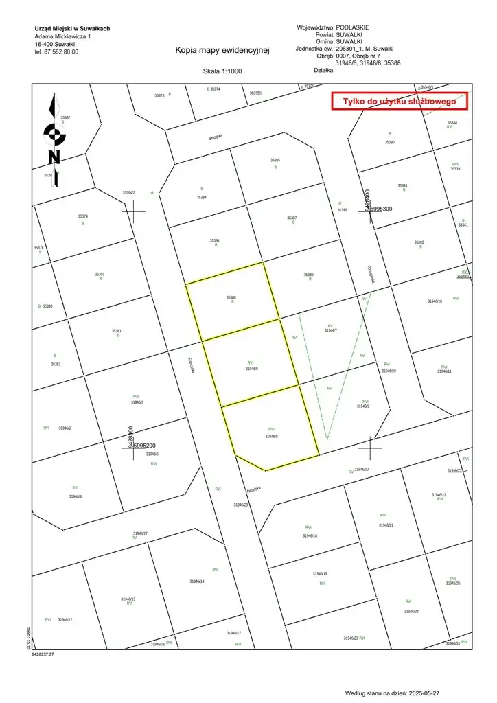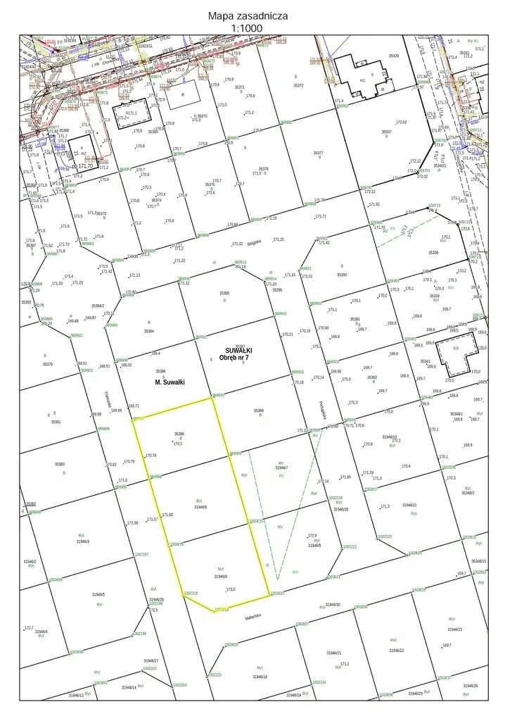 1. Oznaczona działką nr 35388 o powierzchni 0,0853 ha, niezabudowana, położona w Suwałkach w Obrębie nr 7, wchodząca w skład nieruchomości oznaczonej księgą wieczystą nr SU1S/00031671/3. Działka zgodnie z miejscowym planem zagospodarowania przestrzennego południowo - zachodniego rejonu ulicy Zastawie w Suwałkach zatwierdzonym Uchwałą LXVI/871/2024 Rady Miejskiej w Suwałkach z dnia 31.01.2024 roku, objęta jest konturem 11MNW - teren zabudowy mieszkaniowej jednorodzinnej wolnostojącej. Nieruchomość przeznaczona jest do sprzedaży w drodze przetargu ustnego nieograniczonego.
