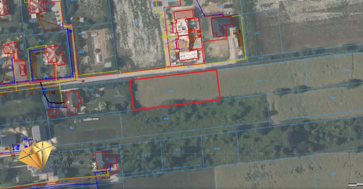 Wymiary działki 75,50m x 26m, pierwsza linia zabudowy przy drodze utwardzonej.
