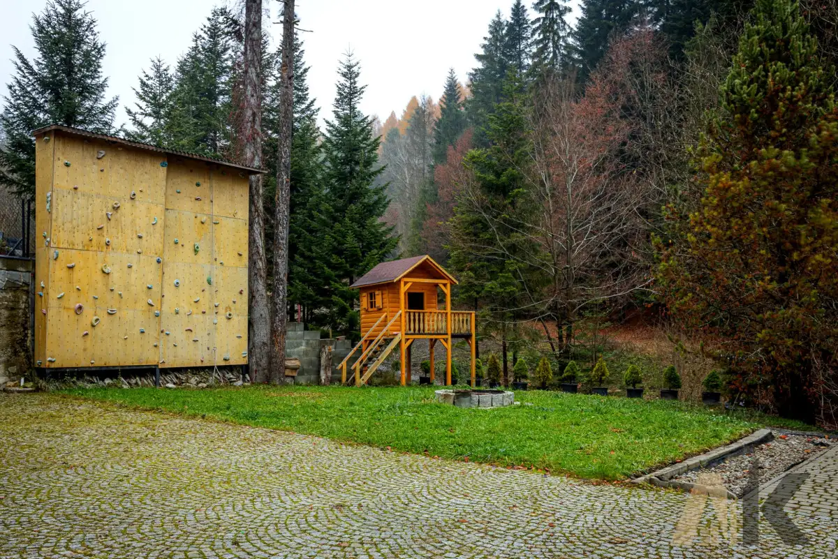 Ścianka wspinaczkowa i drewniany domek dla dzieci sprawia że najmłodsi nie będą narzekać na brak zajęć.