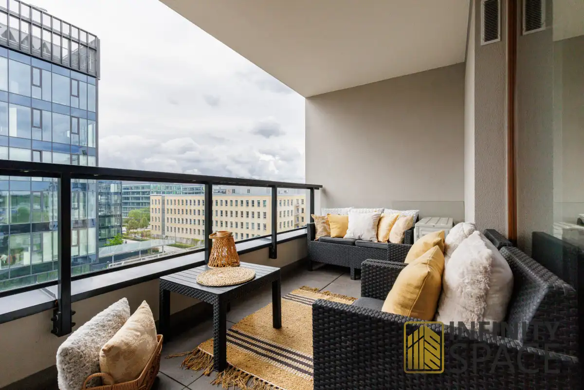 W najbliższym otoczeniu znajdują się liczne biurowce, sklepy, restauracje, kawiarnie, siłownie oraz tereny rekreacyjne. Zaledwie kilka minut spacerem dzieli Cię od Galerii Mokotów, a także przystanków autobusowych, tramwajowych i stacji metra Wilanowska lub Wierzbno, które zapewniają sprawne połączenia z resztą miasta.