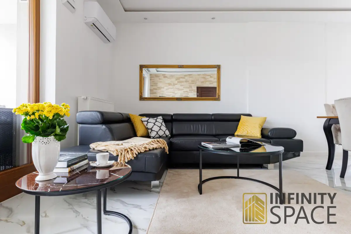 - pokój dzienny ze skórzaną kanapą z funkcją spania i wyjściem na loggię