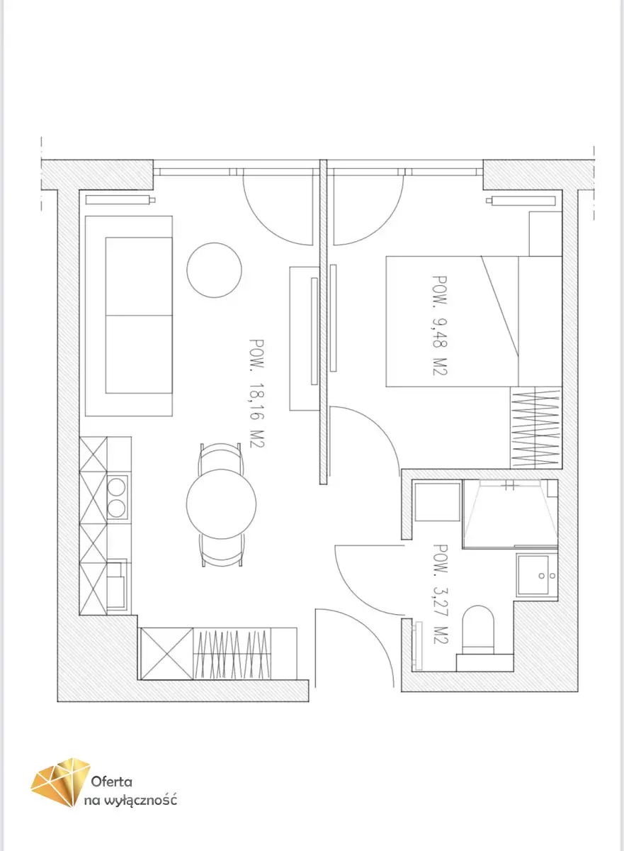 - pokój z aneksem kuchennym o pow.18,16 m² z wyjściem na balkon
