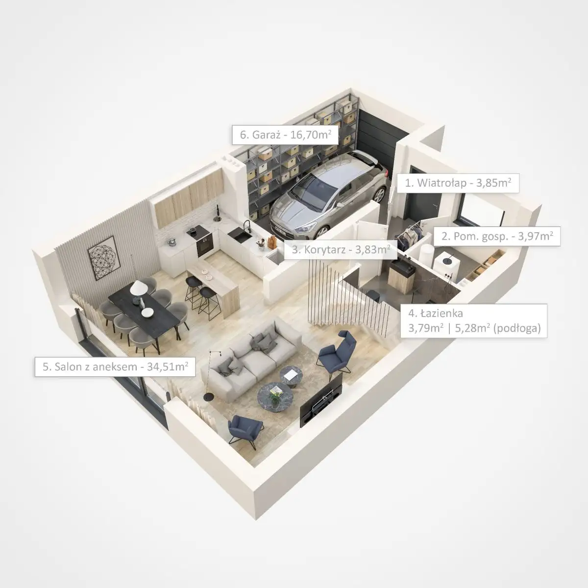 Przestronny salon z aneksem kuchennym - 34,5m²