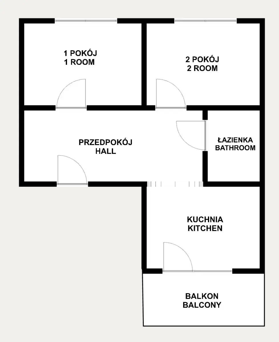 Pokoje: 1 pokój, 2 pokój, kuchnia, przedpokój, łazienka, balkon