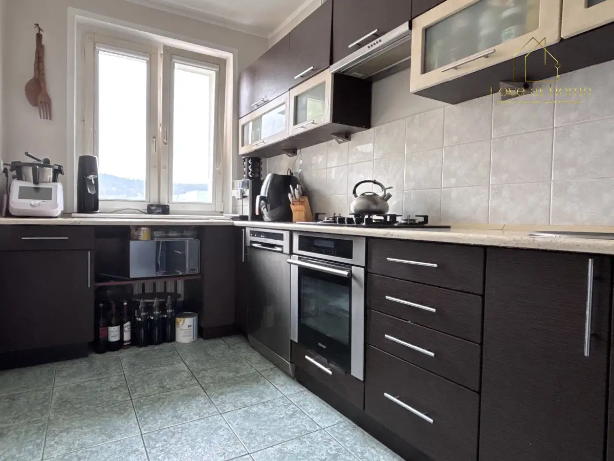 Funkcjonalna kuchnia, meble w ciemnym odcieniu drewna z jasnym blatem tworzą elegancki kontrast. Duże okna zapewniają doskonałe doświetlenie wnętrza, a liczne szafki i szuflady gwarantują dużo miejsca do przechowywania.