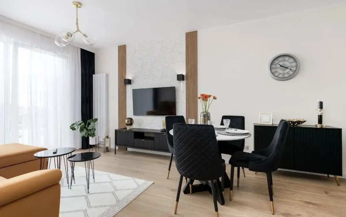 Mieszkanie wykończono przy użyciu wysokiej jakości materiałów. Wszystkie meble znajdujące się w nieruchomości zostały wykonane według indywidualnego zamówienia.