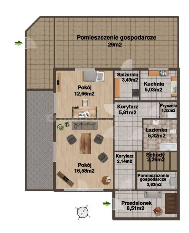 1. Na przyziemiu znajduje się przedsionek, który prowadzi do korytarza, skąd dostępne są wszystkie pomieszczenia oraz schody na wysoki parter. Do dyspozycji mieszkańców jest łazienka z oddzielnym prysznicem, kuchnia oraz dodatkowy składzik. Przyziemie obejmuje także dwa duże pokoje, które mogą pełnić funkcję sypialni, gabinetu lub pokoju dziennego. Dodatkowo, przestrzeń pod tarasem (29 m²) z oddzielnym wejściem z zewnątrz stanowi kolejny obszar użytkowy, który może służyć jako biuro, warsztat lub inne pomieszczenie o przeznaczeniu usługowym.
