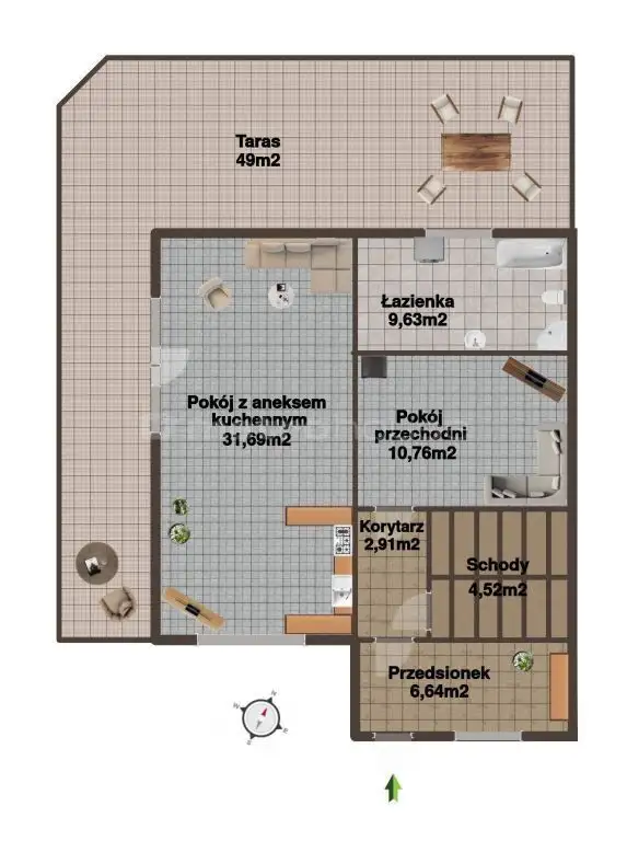 - Duży taras o powierzchni 49 m² na środkowej kondygnacji,