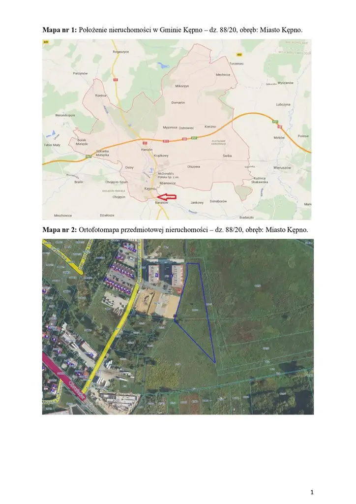 Nieruchomość gruntowa, niezabudowana, położona w rejonie ul. Marszałka Józefa Piłsudskiego w Kępnie, oznaczona w operacie ewidencji gruntów, w jednostce ewidencyjnej Kępno, obrębie: Miasto Kępno, jako działka nr 88/20 o powierzchni 0,7492 ha, klasoużytek:: ŁIV łąki trwałe, dla której Sąd Rejonowy w Kępnie prowadzi księgę wieczystą nr KZ1E/00058396/5.